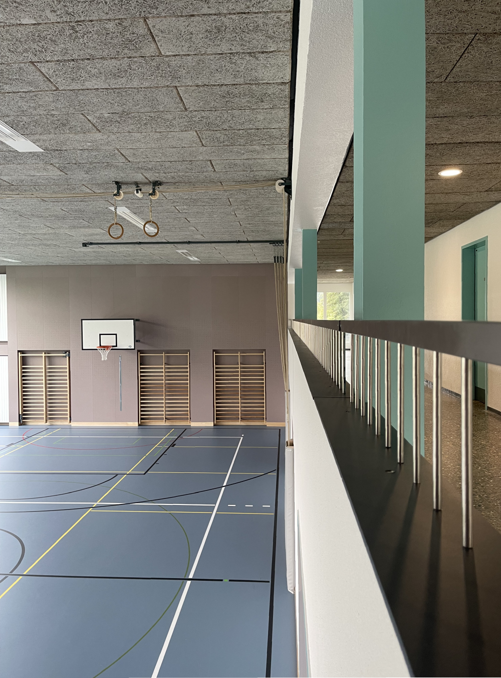 convaincus par la rénovation de cette halle, des travaux similaires (surtout au niveau de la matérialité) ont été réalisés. ainsi, les extrémités est et ouest de la halle ont été isolées et revêtues de panneaux de MDF (panneaux de particules) teintés dans la masse et partiellement perforées afin de créer une meilleure acoustique générale et une finition uniforme.