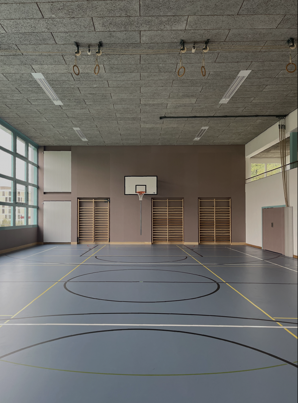 c’est en 2021 que le maître d’ouvrage a accepté un crédit d’engagement permettant une restauration complète intérieure de la halle de gymnastique ainsi que la rénovation des façades et la réfection de la place de sport extérieure.