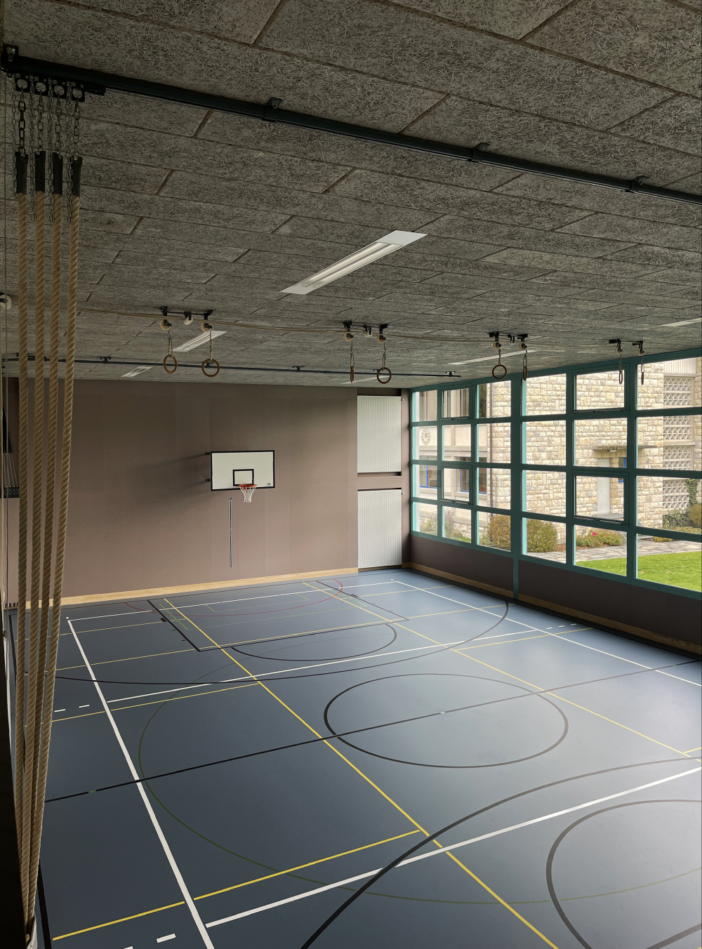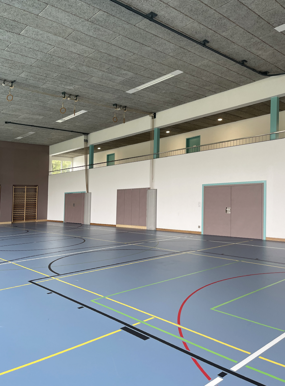 les sols de la halle de gymnastique ont été entièrement refaits. seule la structure porteuse (dalle) n’a pas été touchée. ce dernier a été remplacé par un nouveau sol sportif répondant lui, aux normes en vigueur actuelles. afin de créer une unité, ce sol a été prolongé au niveau du local de rangements des engins mobiles.