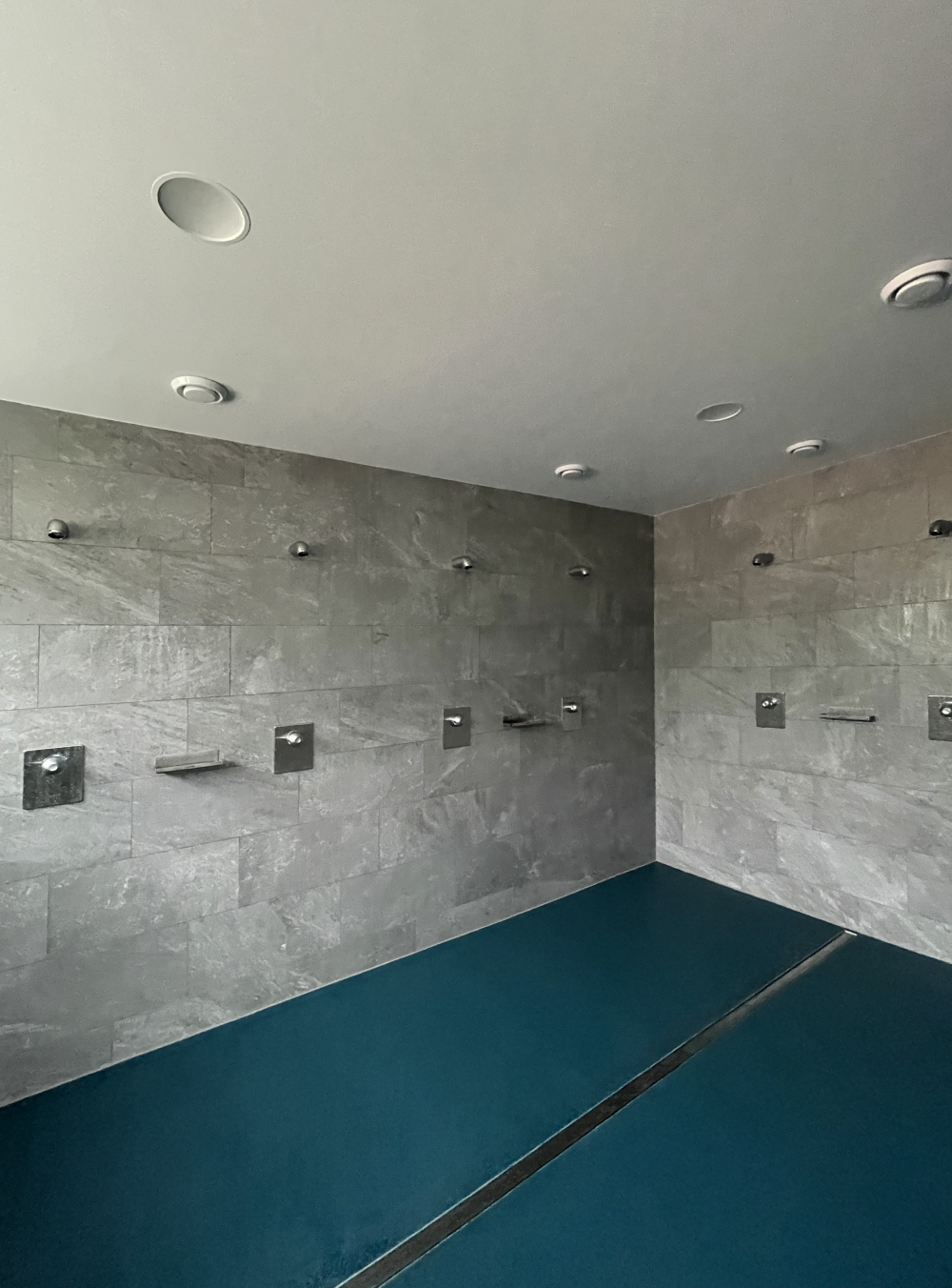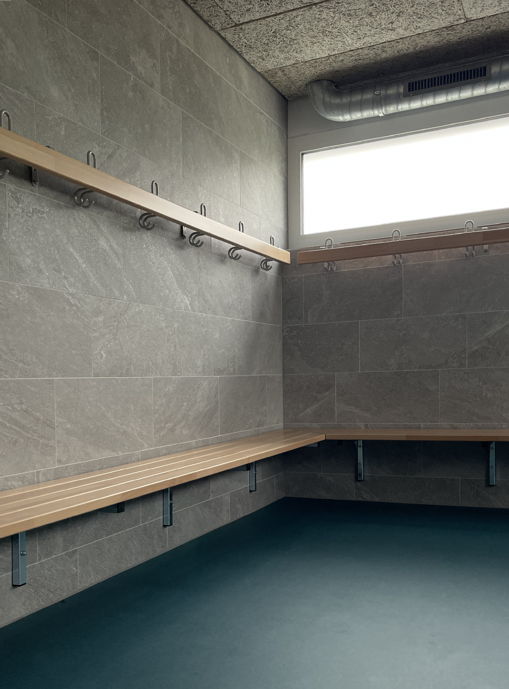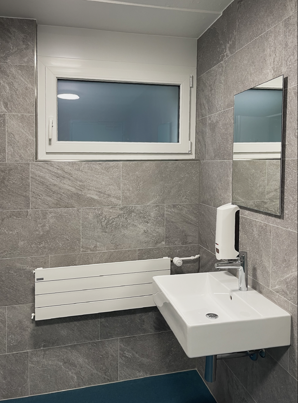 les groupes sanitaires du rez-de-chaussée, les vestiaires du corps enseignant, le local concierge ainsi que les vestiaires de l’étage comprenant des douches accolées à ces derniers, ont totalement été refaits. les parois ont été revêtus de carrelage et de l’haltopex (revêtement en caoutchouc coulé sans joints) a été posé dans toutes les pièces citées précédemment hormis dans le local concierge où le carrelage a été privilégié. la technique complète que ce soit l’électricité, la ventilation, le chauffage ou la tuyauterie sanitaire, a été refaite complètement afin de remettre tout le bâtiment aux normes. de nouveaux faux-plafonds ont été faits dans les locaux sanitaires afin d’y passer de la technique. dans la continuité de tous ces travaux, un rafraichissement de la peinture général a été fait.