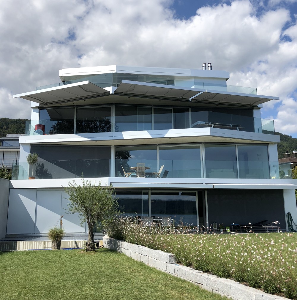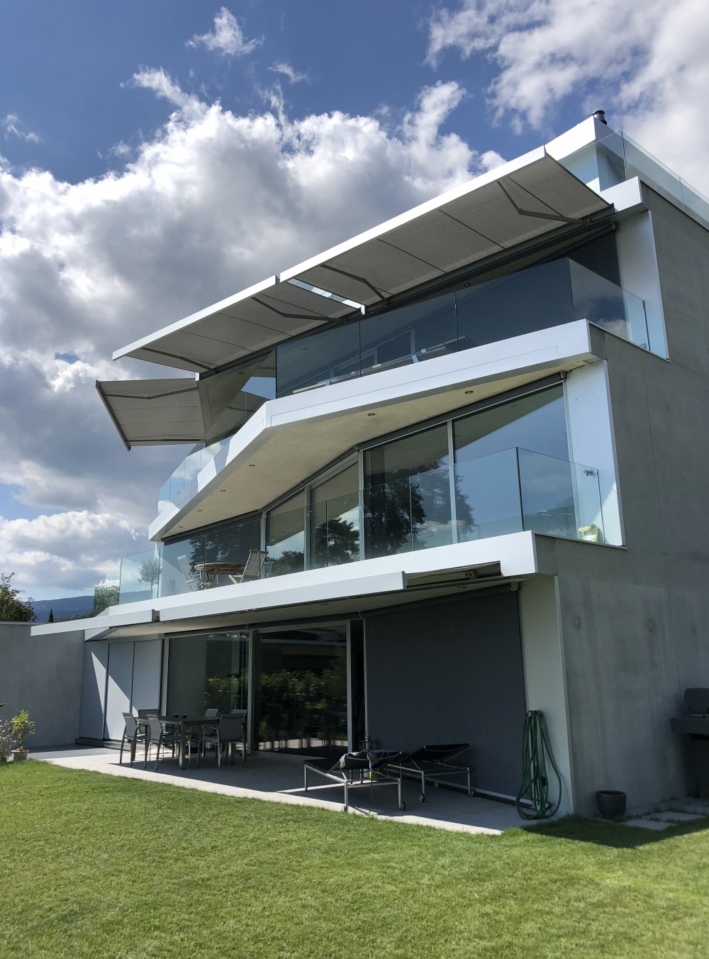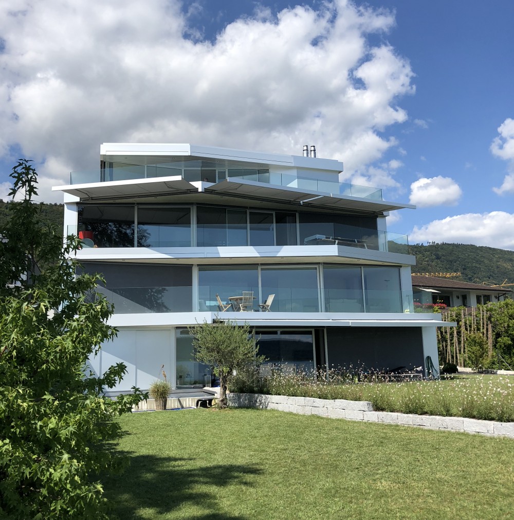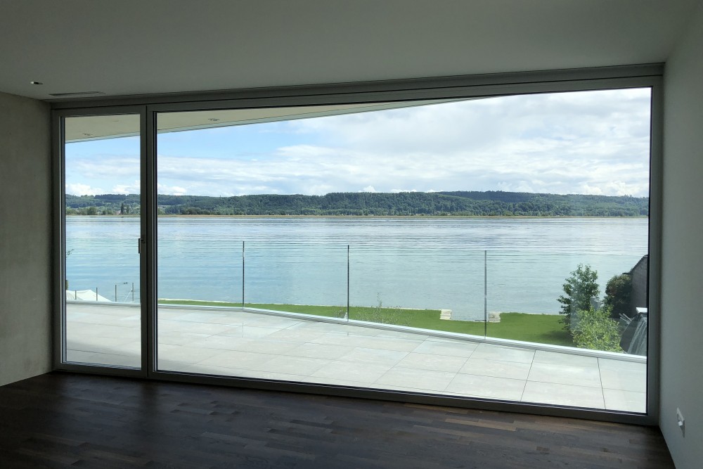 la position et la forme très allongée de la parcelle, la réglementation en vigueur et les accords de droits privés avec la parcelle voisine sise à l'ouest, les vues et l'ensoleillement ont dicté la géométrie des appartements afin d'aboutir à ce que toutes les unités aient les lieux de vie ouverts plein sud et en direction du lac, avec les vues magiques offertes par cette situation.