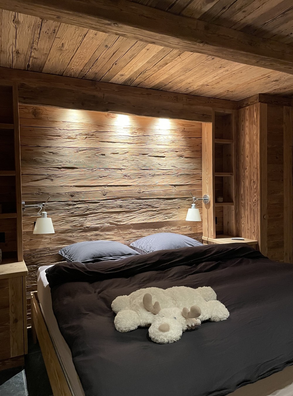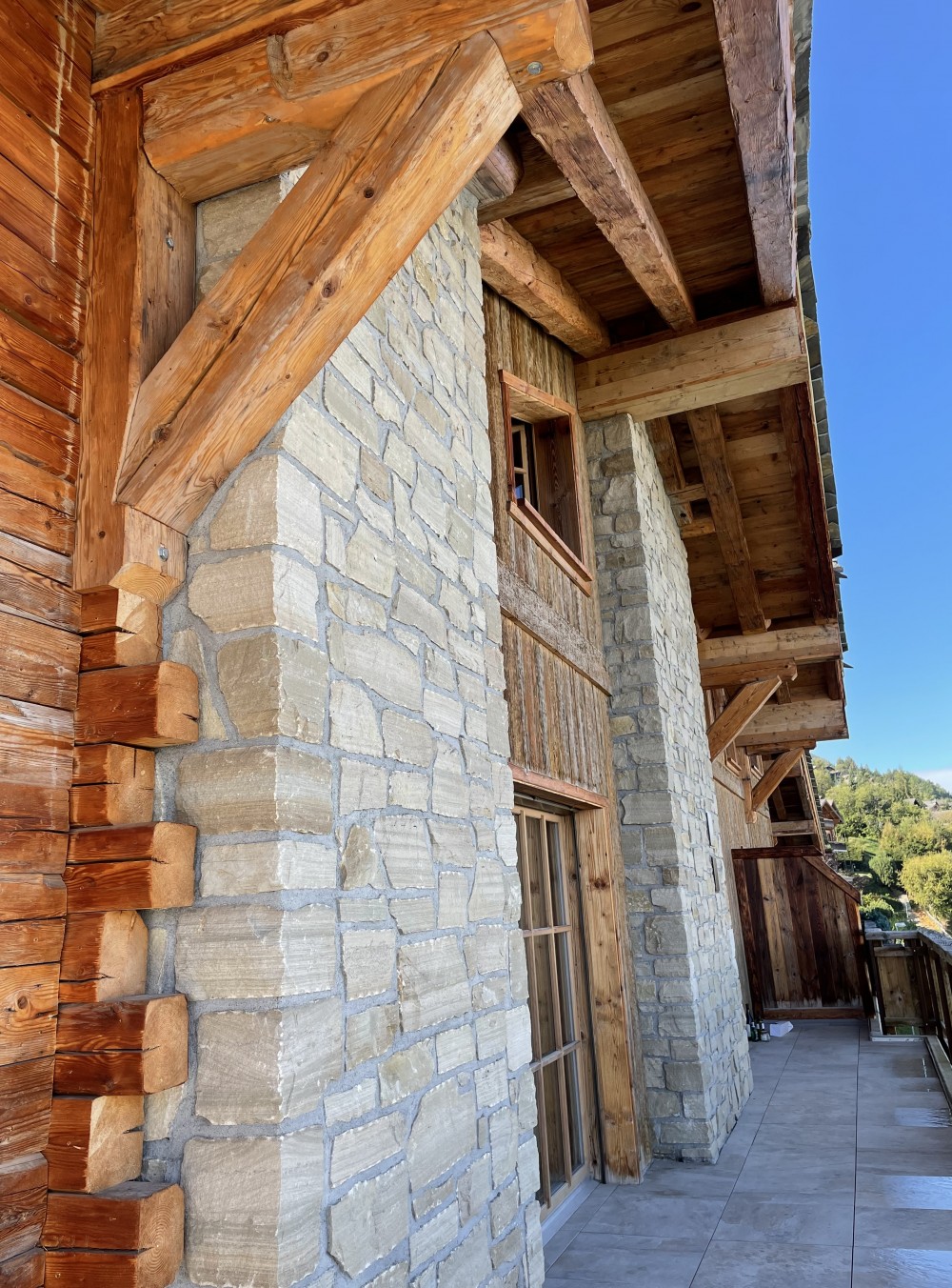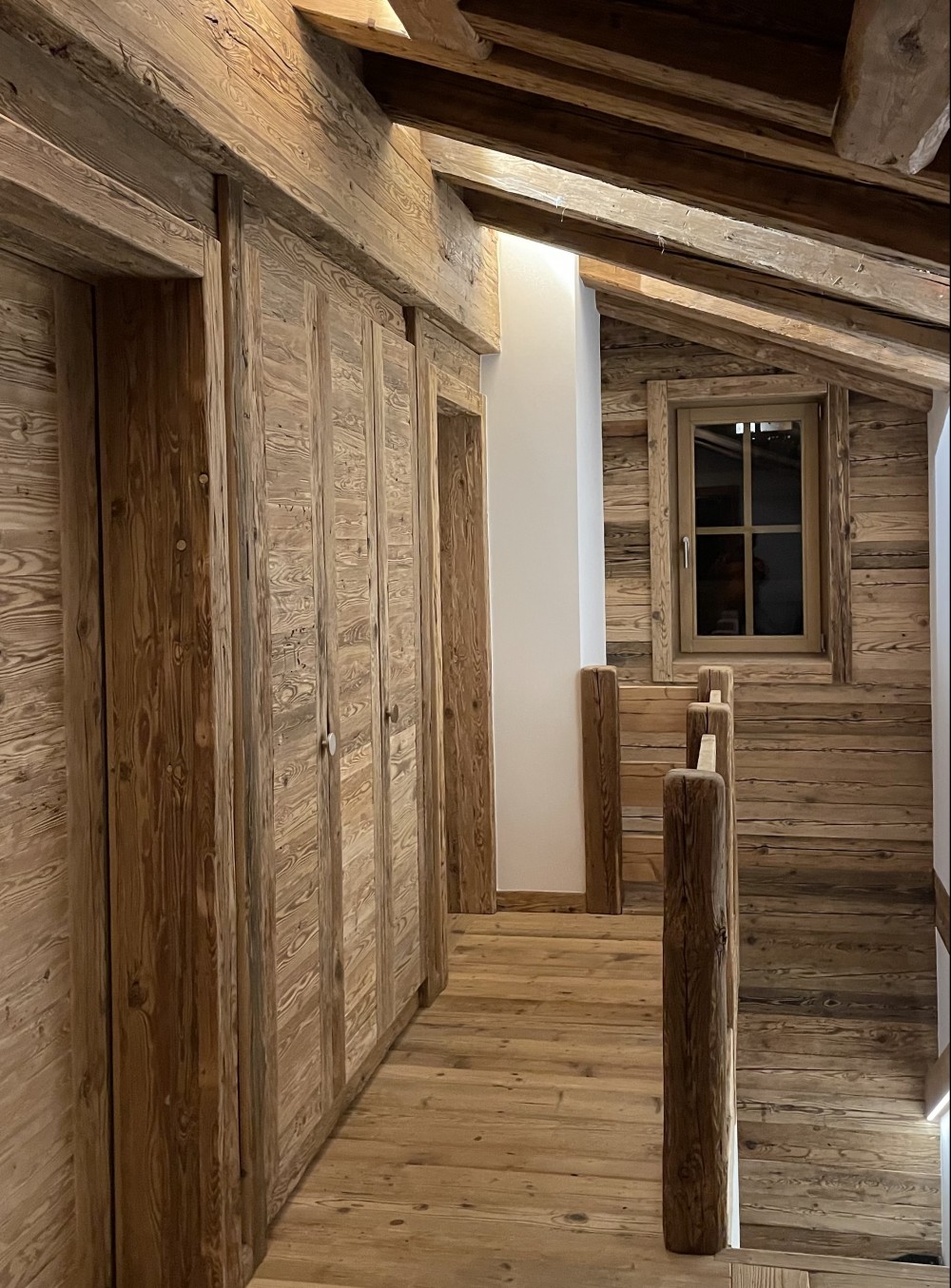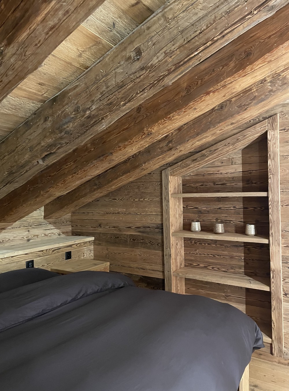 tout le doublage des murs de façades ainsi que le doublage de la dalle de plafond en béton sont réalisés en vieux bois sélectionné chez un artisan de la région.
