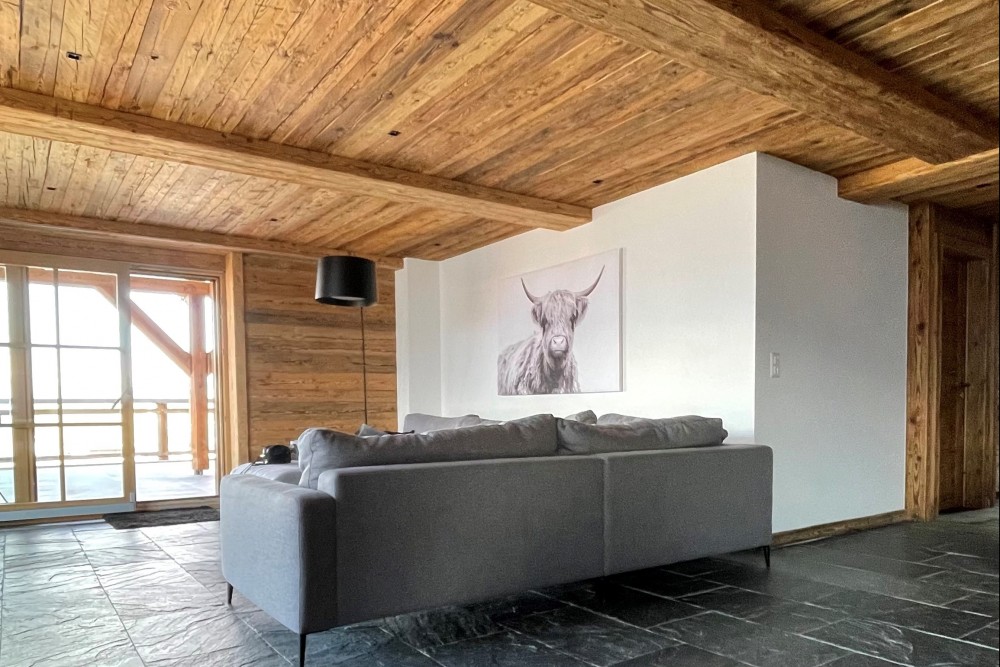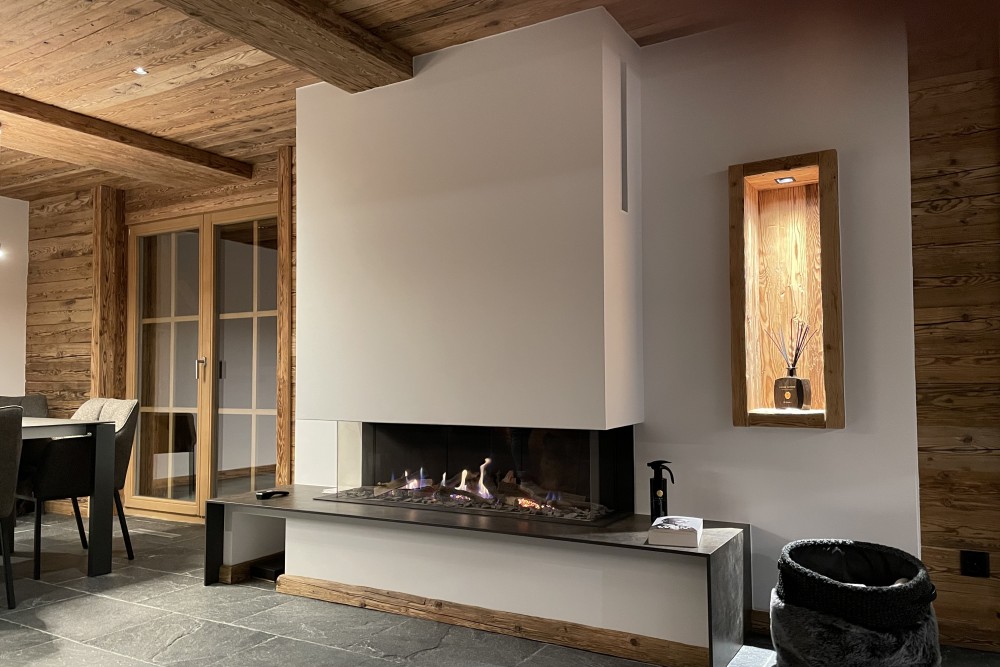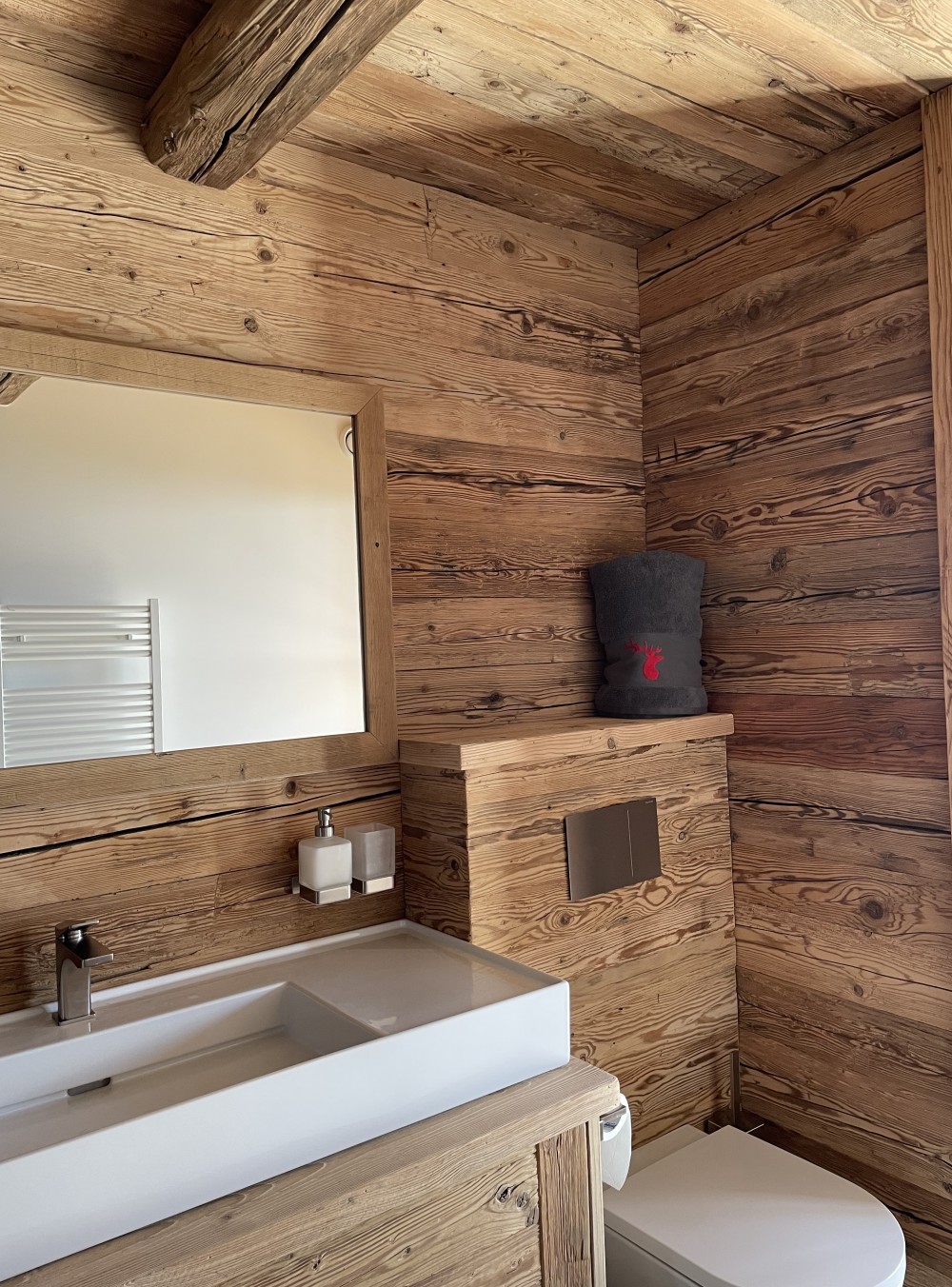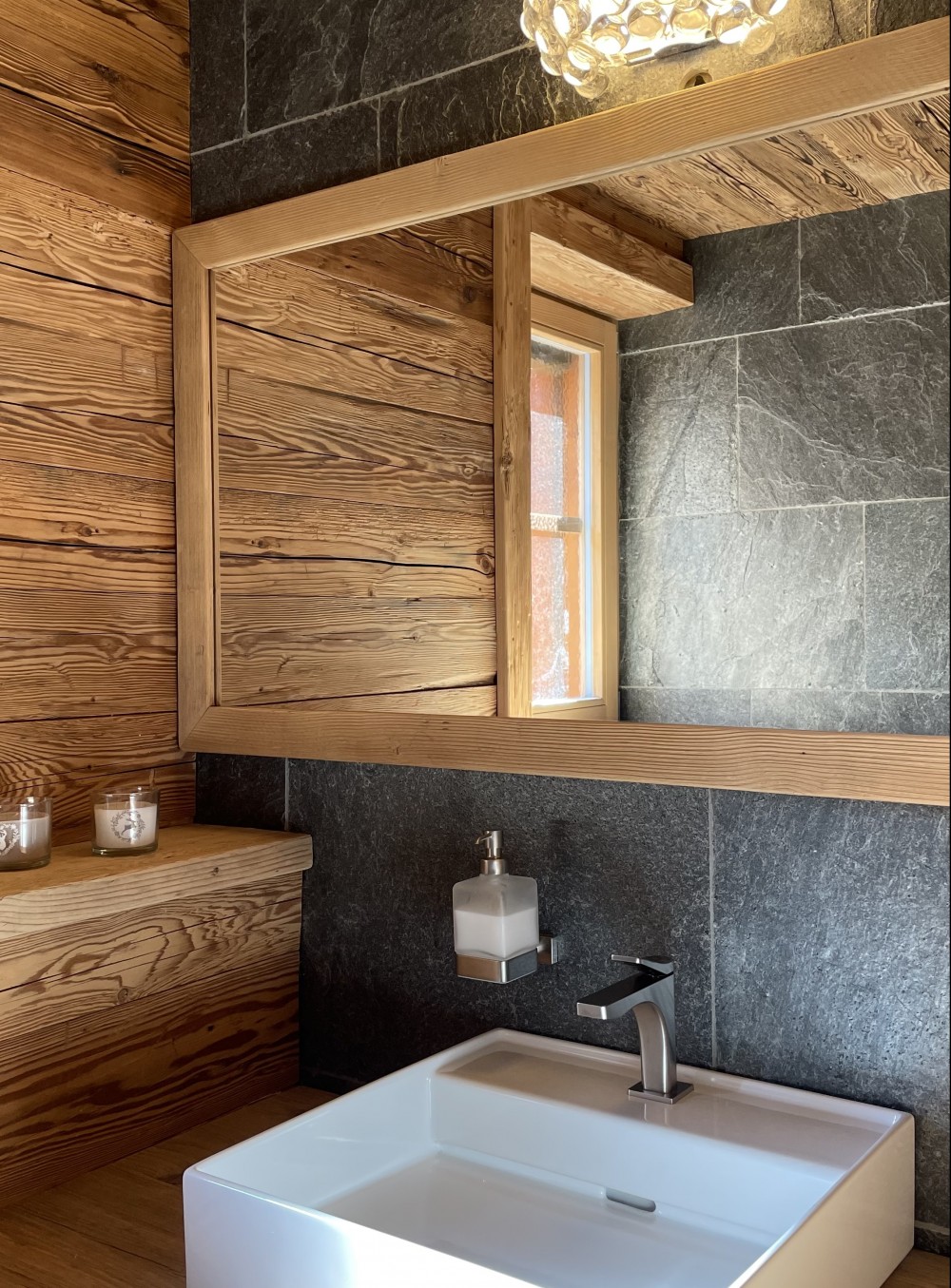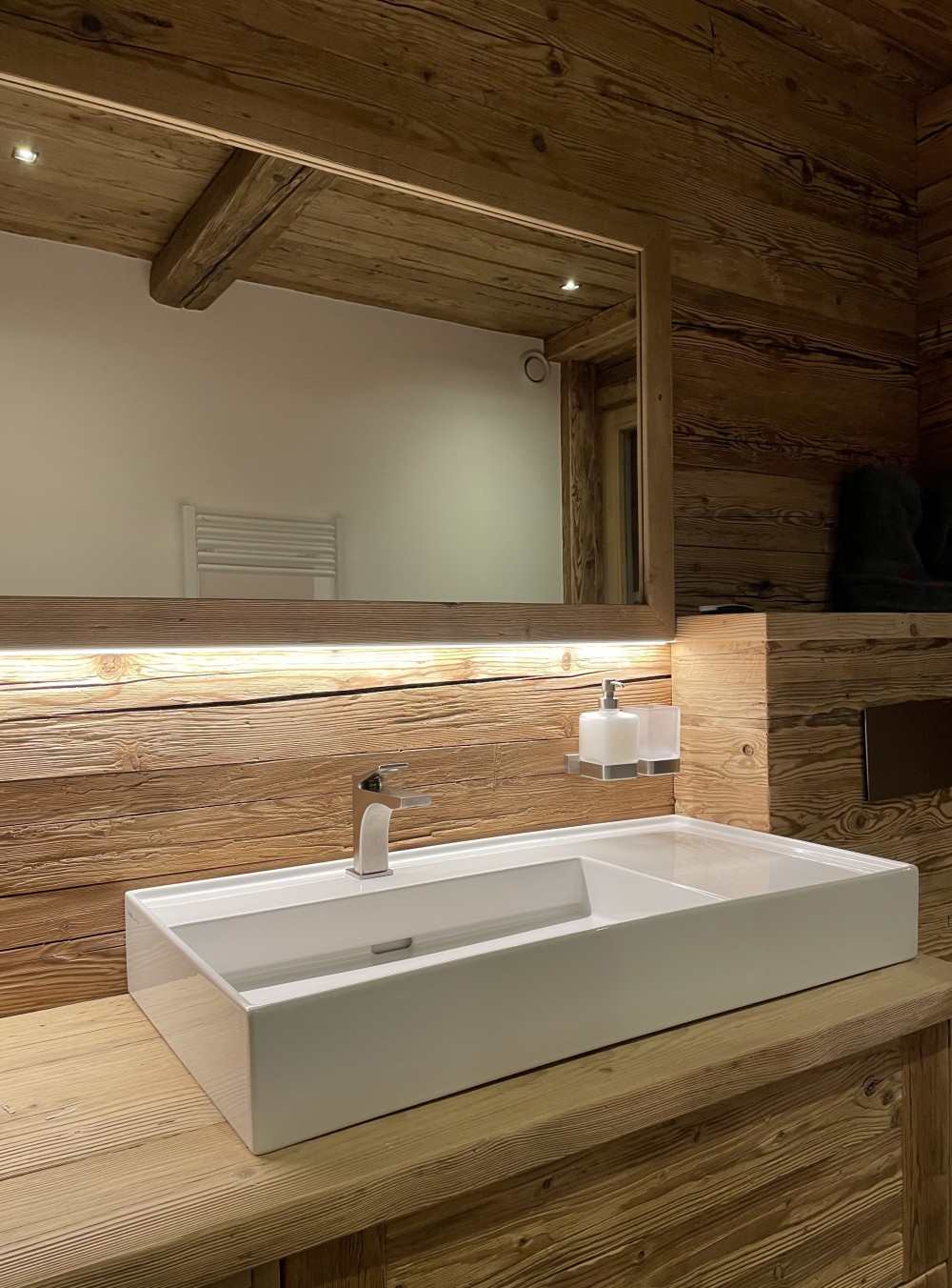 tout le doublage des murs de façades ainsi que le doublage de la dalle de plafond en béton sont réalisés en vieux bois sélectionné chez un artisan de la région.