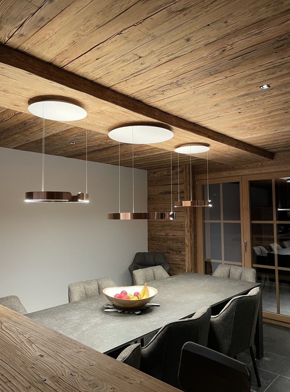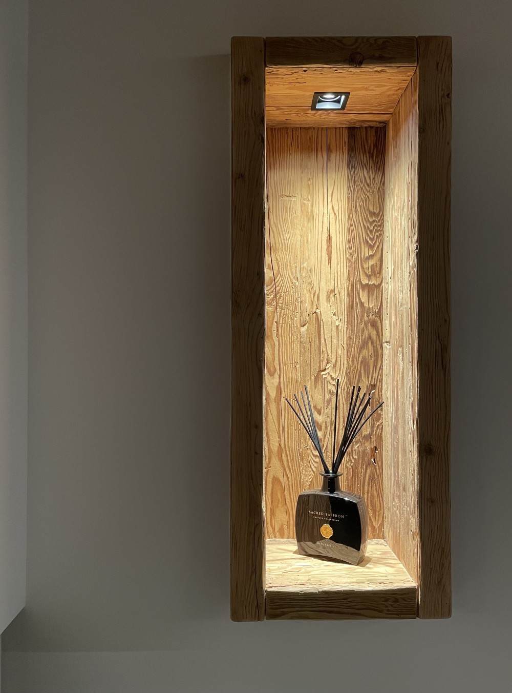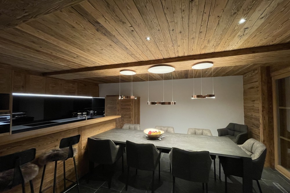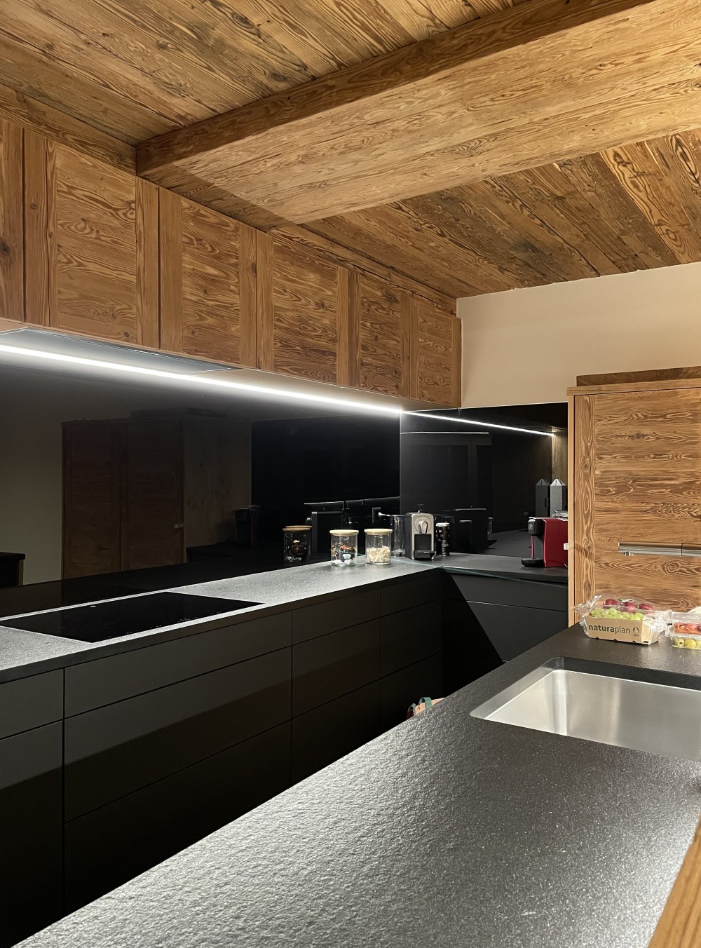 la cuisine est réalisée en vieux bois également, avec certaines parties travaillées de manière plus contemporaine avec un revêtement stratifié « phoenix » noir. un soin particulier a été apporté à l’éclairage avec de petit spots en acier noir mat et des luminaires de qualité.