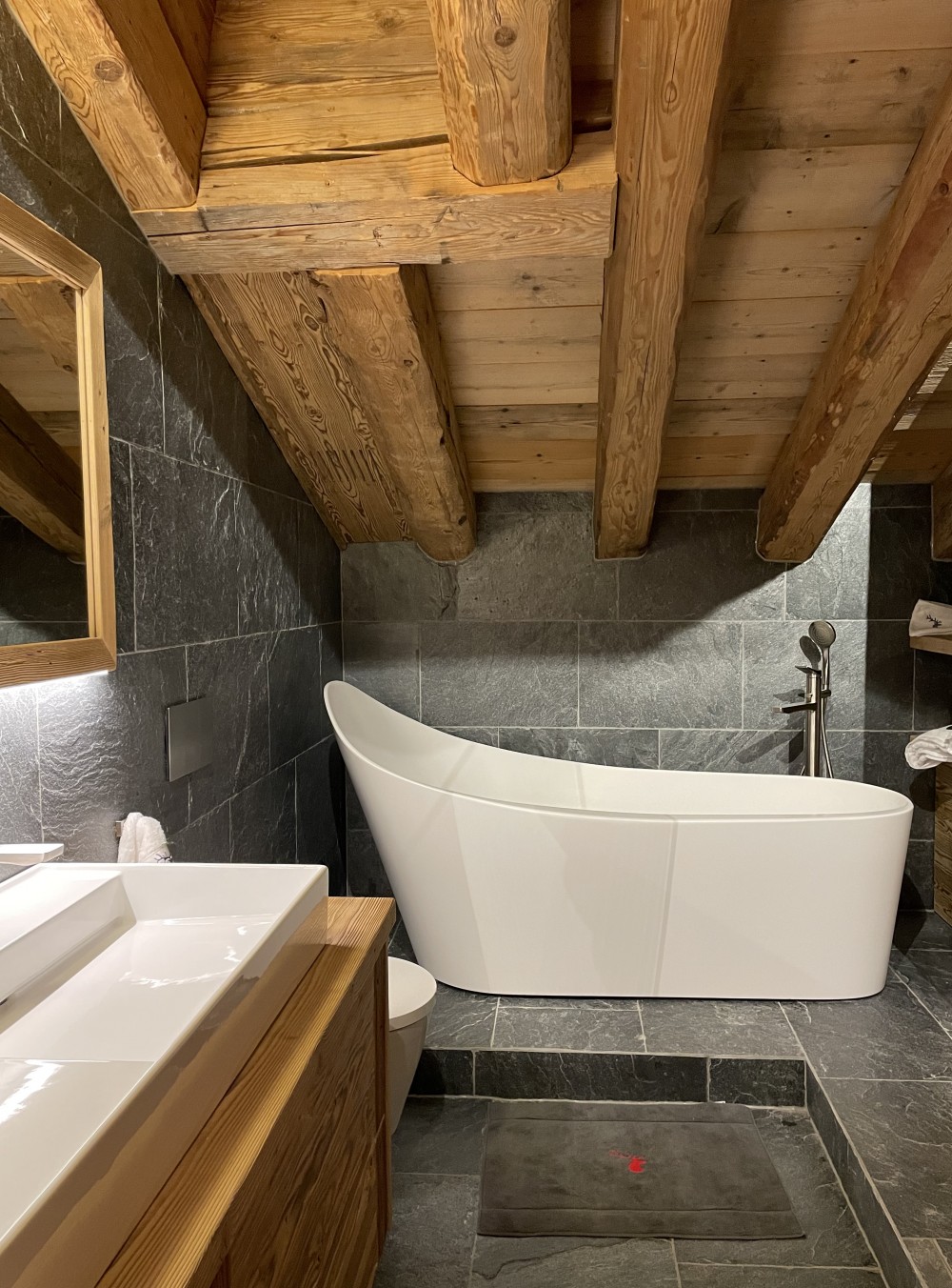 les sols de ce niveau sont en plancher de vieux bois. les salles d’eau reprennent la même pierre naturelle que le niveau inférieur.