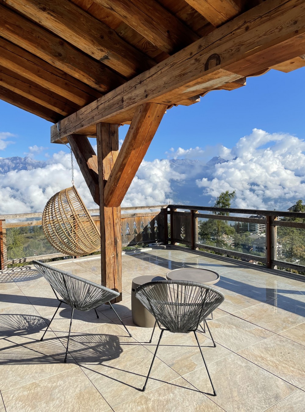 le bâtiment comprend trois niveaux de 3 appartements et en toiture deux duplex, que l’on peut presque considérer comme des chalets posés sur le toit avec chacun une grande terrasse de plus de 120 m2.