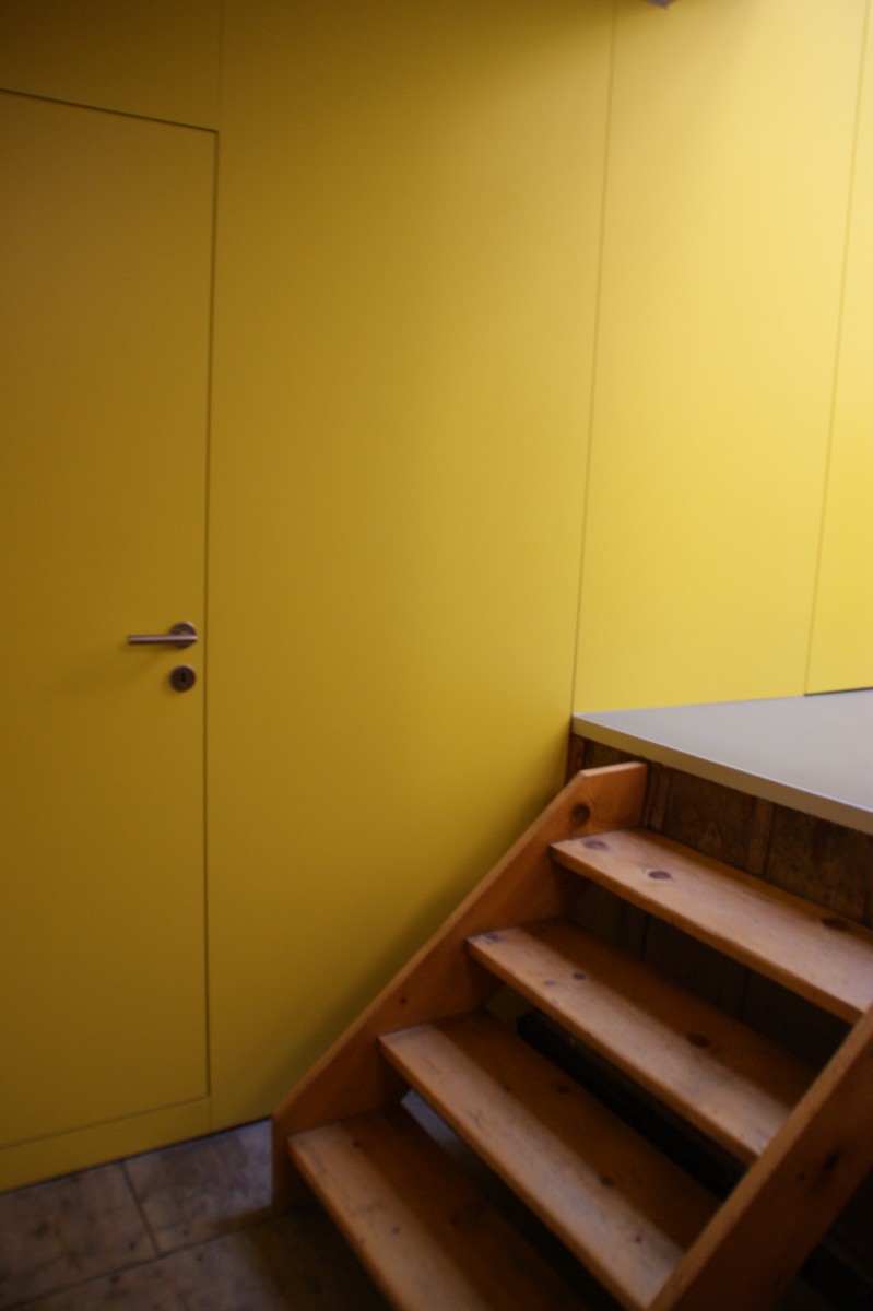les sols sont en linoléum ou en chape d'anhydrite teintée brute pour la cuisine, les faces en menuiserie giclée ou gypsées lisses, alors que les plafonds sont lissés au plâtre. un jeu de couleurs a été élaboré dans le but de reconnaître les différentes parties de cette intervention. tous les éléments existants pouvant être maintenus ou conservés l'ont été dans un respect maximum du travail de l'époque.