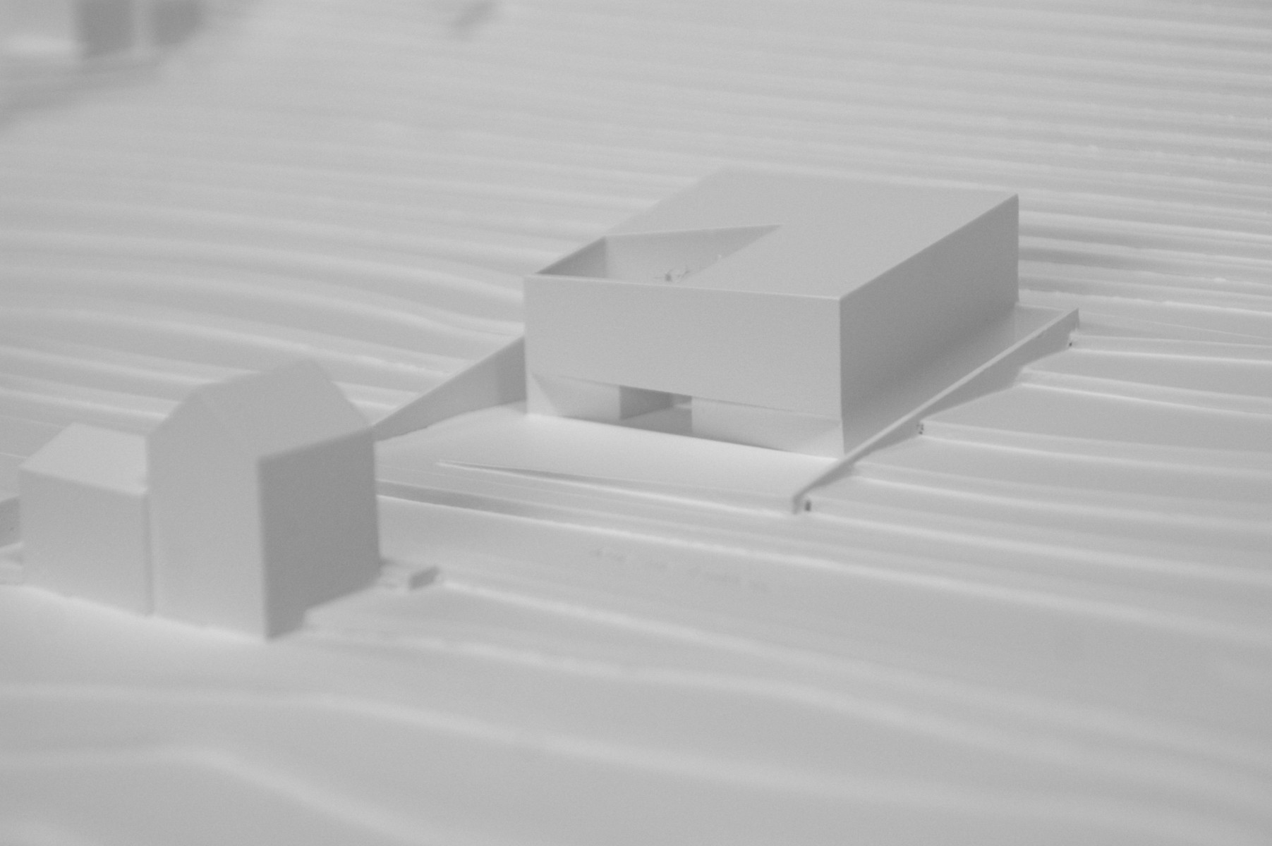 la deuxième approche plus régionale nous situe dans les premiers plis de la chaîne du jura, là où précisément ont été déposés les blocs erratiques en provenance des alpes suite à la dernière glaciation, très nombreux au pied du jura puis de moins en moins présents au fil des vallées. ces blocs sont composés de roches alpines, et donc facilement reconnaissables car de composition différente de celle des roches du terrain sur lesquels ils reposent, isolés, tels des statues. ce thème est repris pour la forme et la matérialisation du volume bâti, traité comme un monolithe érodé et sculpté par les millénaires et les forces de la nature, posé librement au milieu du paysage.