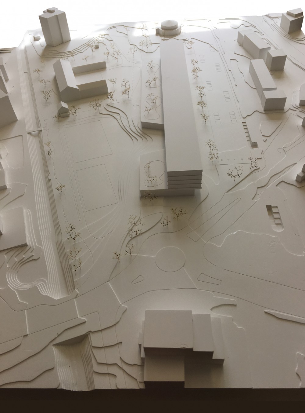 Le bâtiment projeté se veut être une marque forte qui vient composer avec les espaces publics environnants, à savoir le Cours Roger-Bonvin et le futur réaménagement du canal de Vissigen. Il se doit également d'être un trait d'union, à plus large échelle, entre la gare, son développement Sud (Campus HES et Ronquoz 21) et le pôle santé via la future place du Rhône et le futur parc des Ateliers.