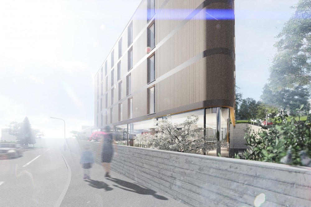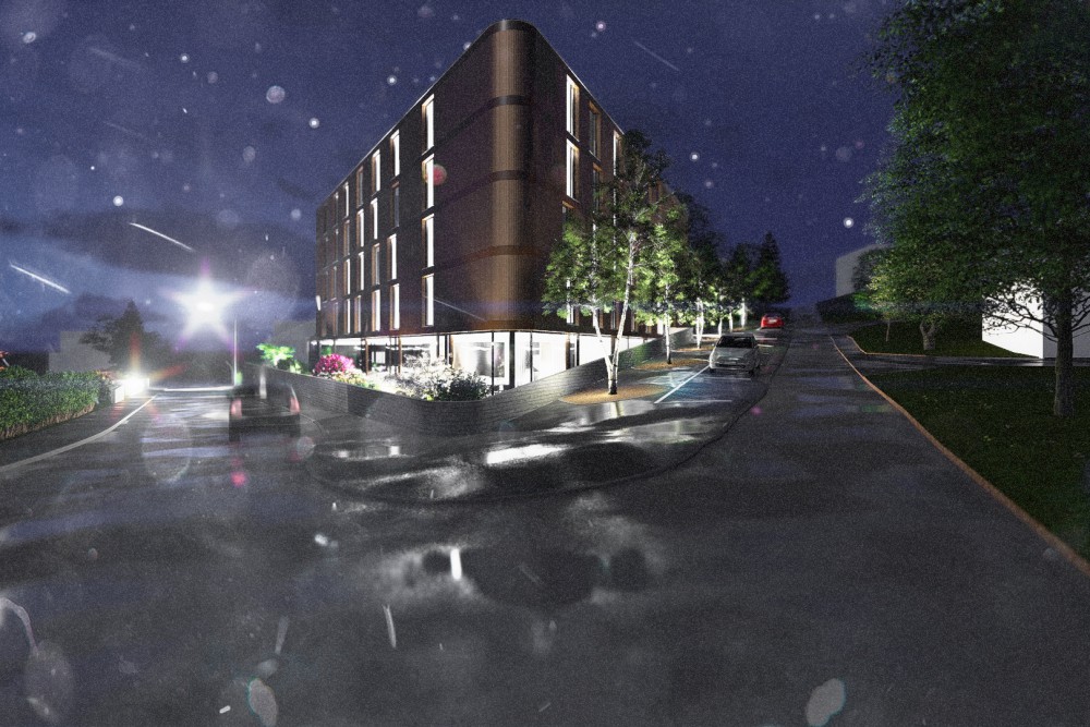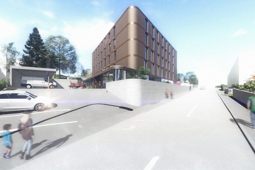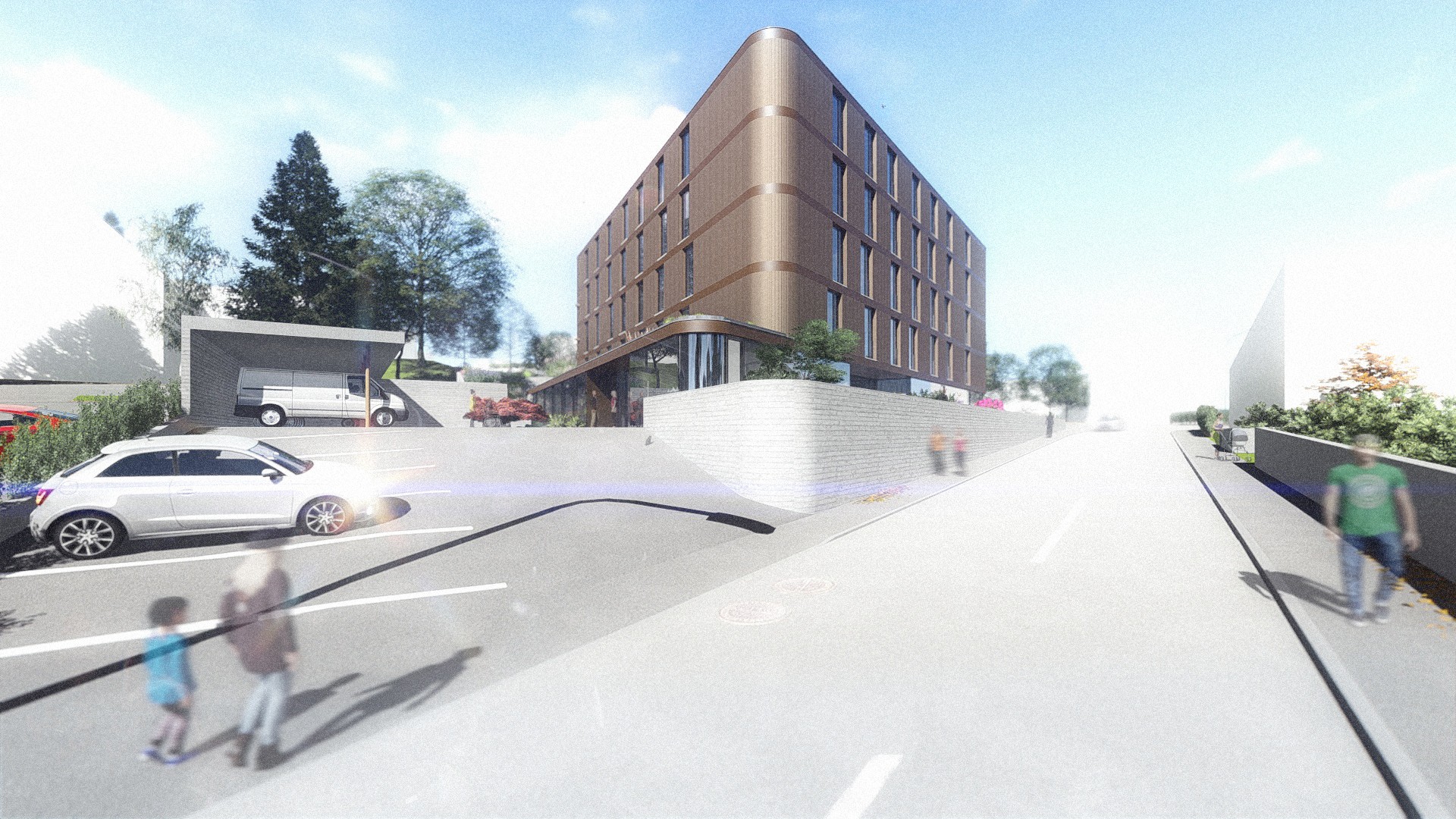 le bâtiment projeté fait face aux usagers du chemin de la cigale. sorte de portique d'entrée, il se veut être un jalon fort, se distinguant par une architecture épurée et sobre tout en restant à l'échelle de l'ensemble bâti qui l'entoure. sa forme se joue des contraintes du plan parcellaire complexe en utilisant celles-ci afin d'en faire une image forte. en respectant les limites constructibles qui viennent côtoyées, une forme claire s'intégrant pleinement au site est obtenue.