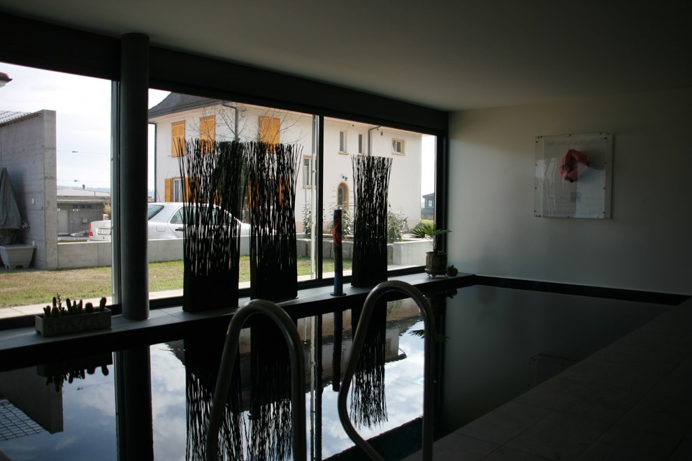 un sous-sol avec les locaux techniques, 1 appartement en duplex avec piscine couverte accessible pour tous les locataires au rez-de-chaussée, un appartement de 2 pièces et 1 attique de 4 pièces composent ce petit immeuble résidentiel de bon standing. les grandes surfaces vitrées, excepté au nord du bâtiment, jouent avec les reflets de l'environnement, permettant d'intégrer ce bâtiment de manière plus discrète et légère dans son environnement. un mur de pierre, à l'image des murs de vignes, clôt la parcelle. le jardin est ainsi comme posé sur un plateau surélevé de quelque 70 cm en dessus des parcelles voisines.