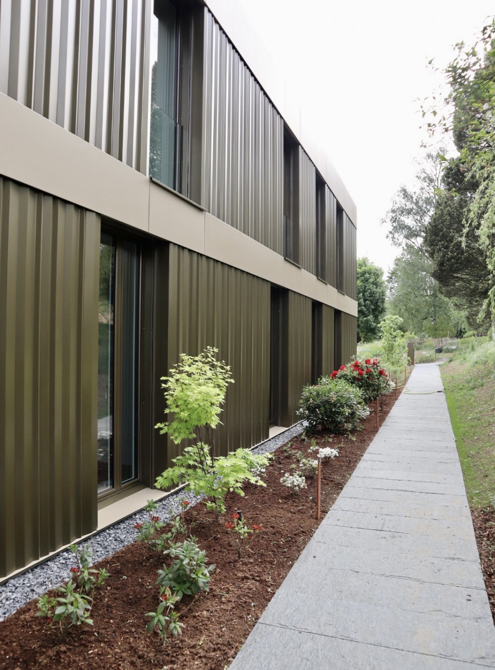 situé en zone h2, nous avons utilisé les possibilités offertes par la réglementation en vigueur. nous avons ainsi abouti à la construction d’un projet comprenant un petit immeuble de 4 appartements de haut standing, répartis sur deux niveaux. le bâtiment relativement long et filigrane flotte comme un vaisseau dans le verger existant. le tout comprend donc 4 appartements en ppe, dont les deux unités du rez-de-chaussée possèdent chacune des jardins privés.