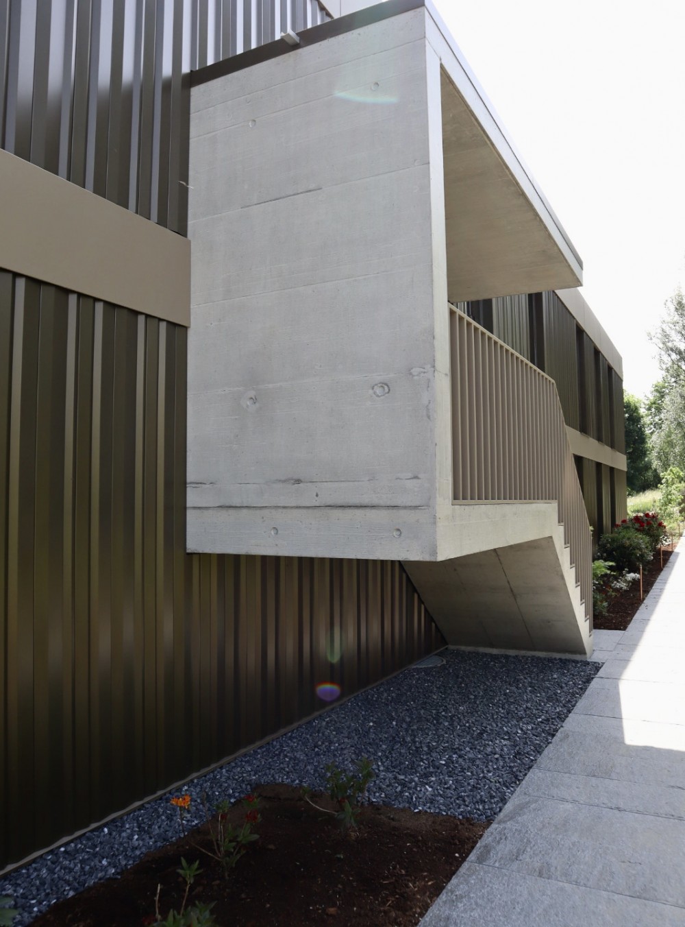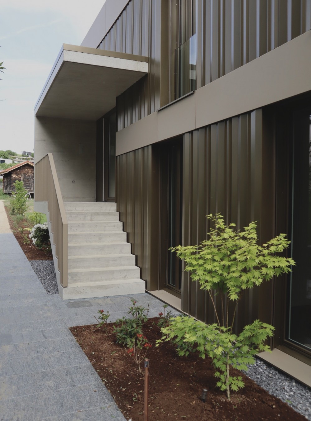 la position et la forme très allongée de la parcelle, la réglementation en vigueur et les restrictions pour les distances au ruisseau enterré, les vues et l’ensoleillement ont dicté la géométrie des appartements afin d’aboutir à ce que toutes les unités aient les lieux de vie ouverts plein sud. les appartements en quinconce permettent d’avantager l’appartement est par rapport à l’appartement ouest qui jouit de la façade ouest et du soleil du soir.