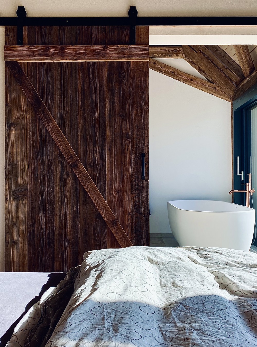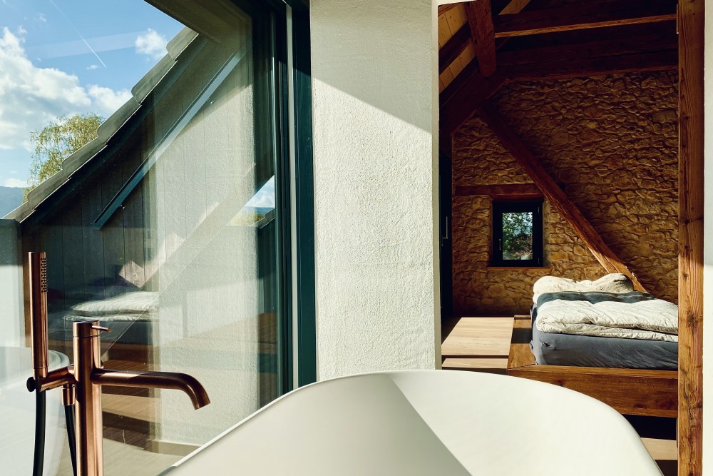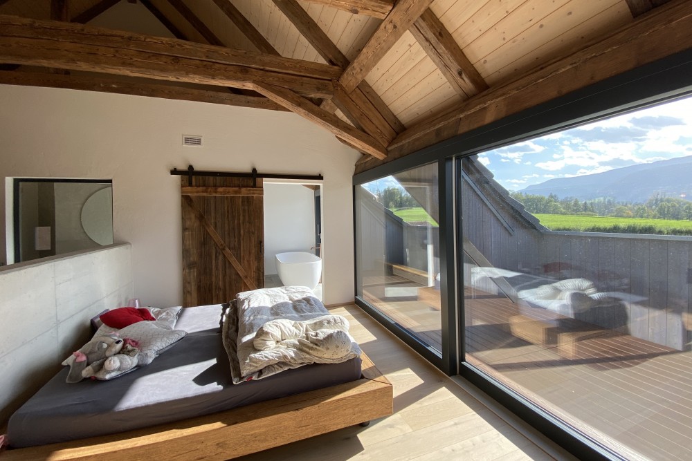 pour sublimer cette chambre, une terrasse encastrée dans la toiture est créée. discrète, elle ne perturbe pas l’architecture générale de la ferme mais permet une vue spectaculaire sur le paysage depuis la chambre parentale.