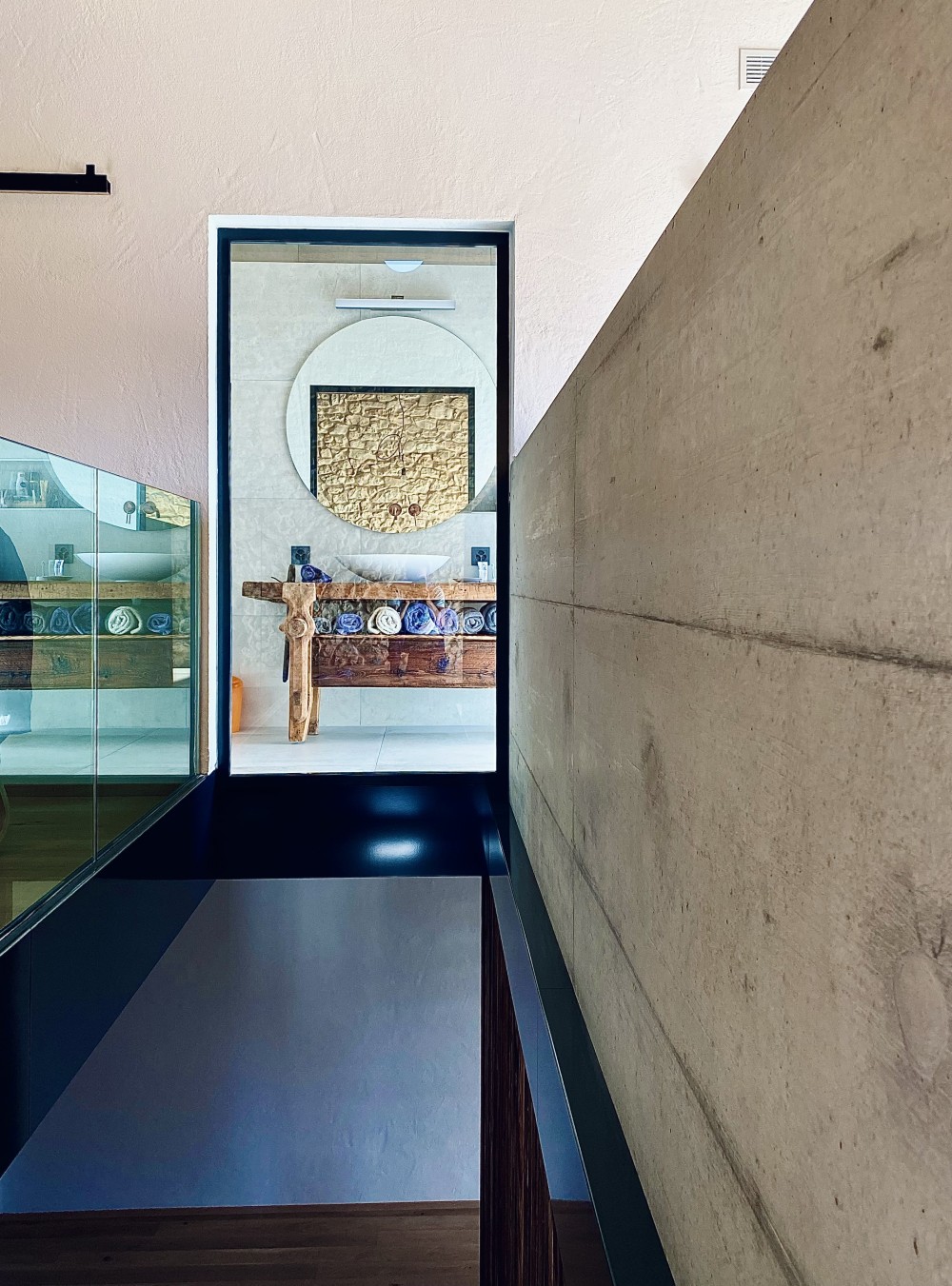les éléments constructifs de la maison sont conservés (escalier, murs porteurs) mais toutes les cloisons sont démontées afin d’apporter plus de lumière et des espaces plus généreux à cet étage. les fenêtres côté ouest sont également agrandies afin de pouvoir sortir directement du rez et profiter de la terrasse et de la piscine.