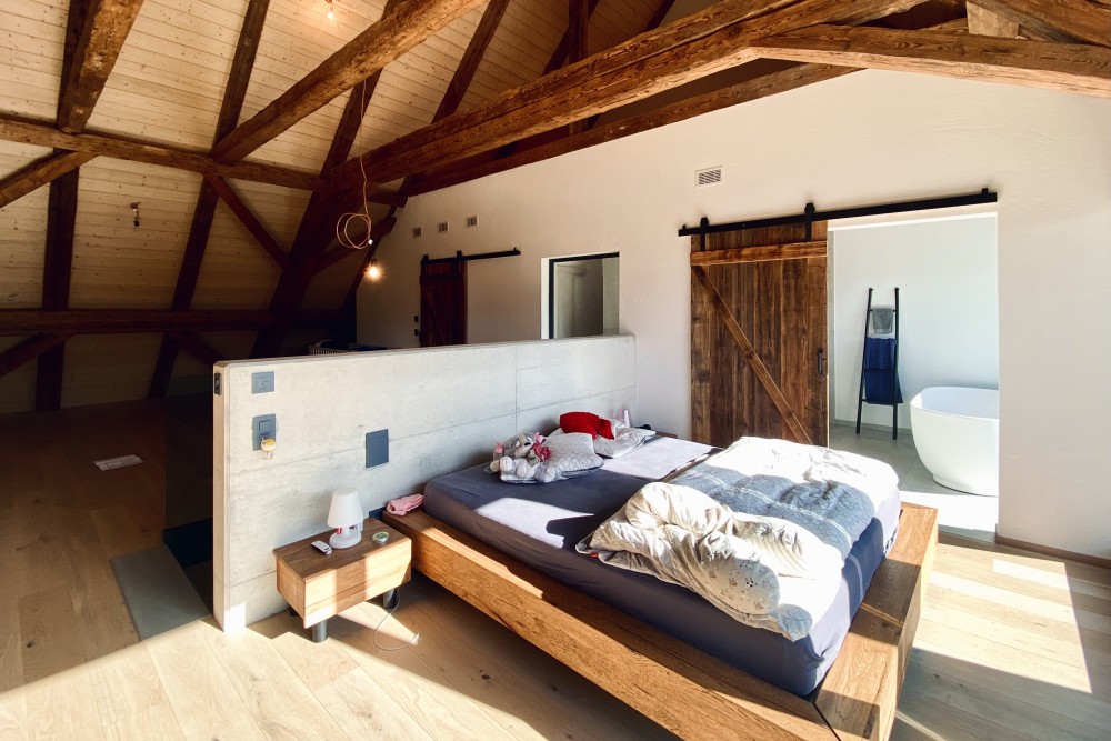 puis le comble est aménagé. ce grand volume accueille la suite parentale et lui donne un caractère exceptionnel.