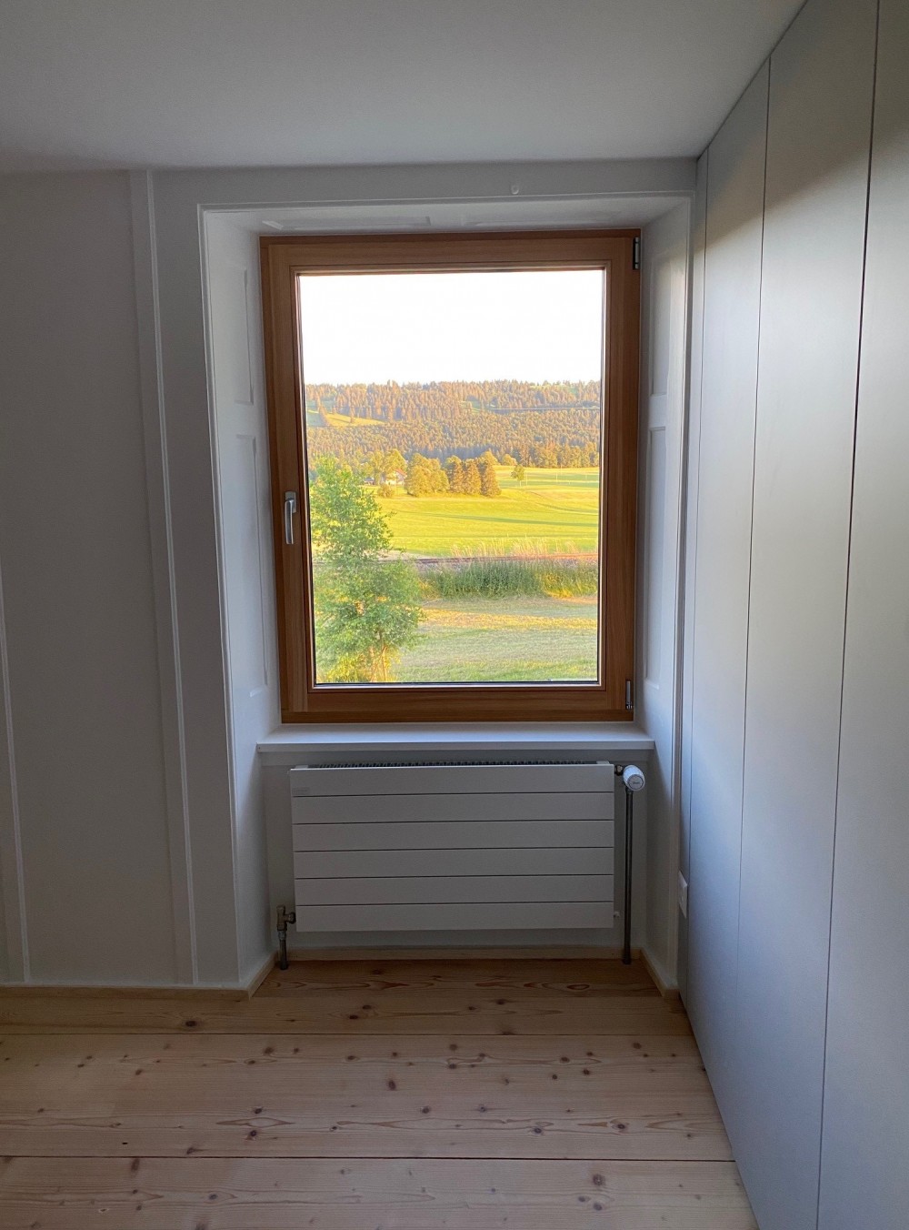 sacrilège ou pas, les fenêtres en mélèze naturel sont dépourvues de croisillons. pourquoi tolérer des croisillons collés sur des fenêtres en plastique venues d’au-delà de nos frontières alors que des entreprises de la place travaillant le bois sont à même de présenter des solutions élégantes et actuelles ? le débat est lancé mais du point de vue des propriétaires, le dialogue entre les anciennes embrasures et les nouvelles fenêtres fonctionne. la précieuse lumière du soleil n’est ainsi pas obstruée et les clairs de lune n’en sont que plus appréciables.