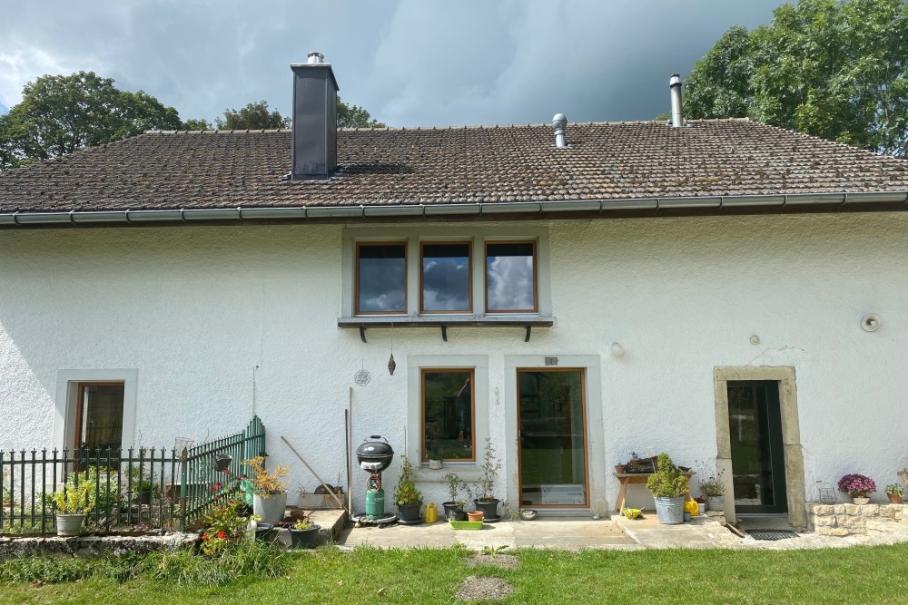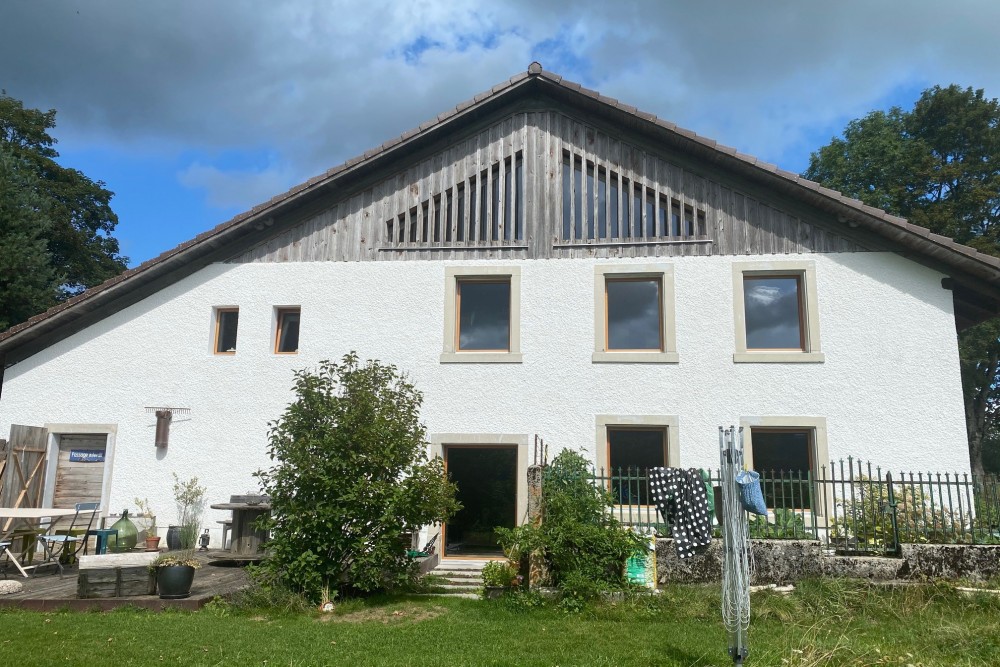 nous sommes aux reussilles, porte des franches-montagnes. en fait, nous ne sommes pas au milieu des reussilles mais au milieu des prés. l’adresse est sans équivoque. bordée de part et d’autre de champs, cette ancienne petite ferme trouve, en limite de parcelle sud, la ligne ferroviaire des CJ. on y accède par un chemin blanc, chemin généreusement fréquenté par les promeneurs, cyclistes et cavaliers les jours de beau temps. la date de construction de la bâtisse ne nous est pas connue. on imagine, au regard de la documentation, de la typologie et des détails de construction, que celle-ci doit avoir environ 170 ans. les photos retrouvées montrent l’évolution des façades au fil des années. on notera, par exemple, l’évolution de la façade sud avec ses lames en bois.