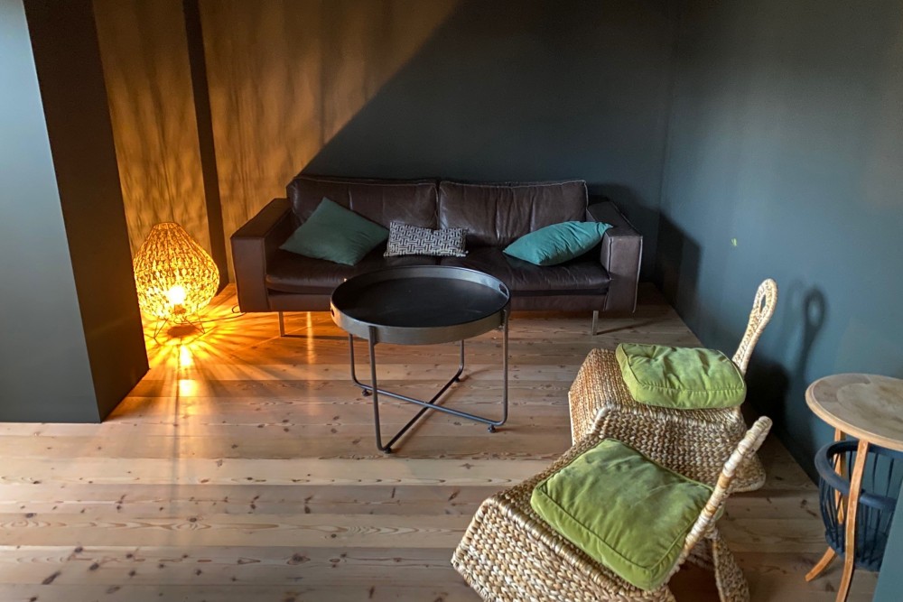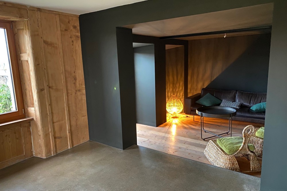 le bâtiment étant situé hors zone à bâtir, l’agrandissement des zones chauffées intérieures s’est fait à raison d’un suivi strict des prescriptions de la LAT24. dans la mesure du possible, la volonté des propriétaires était de maintenir les éléments anciens et de combiner astucieusement ceux-ci avec des interventions contemporaines ponctuelles. ainsi, le fourneau à banc trône toujours dans la pièce à vivre, les boiseries ont été ou sablées ou peintes en blanc. à côté de ces éléments, des plafonds lissées ou une menuiserie épurée prennent place. au sol, on trouve soit une chape de ciment brute juste poncée et traitée dans les espaces communs, soit des planches de sapin blanchies dans les pièces privatives. des peintures dites « naturelles » ornent les murs. le choix du mode d’exécution de ces transformations a aussi été déterminé essentiellement de manière à permettre aux propriétaires de réaliser par eux-mêmes un maximum de travaux.