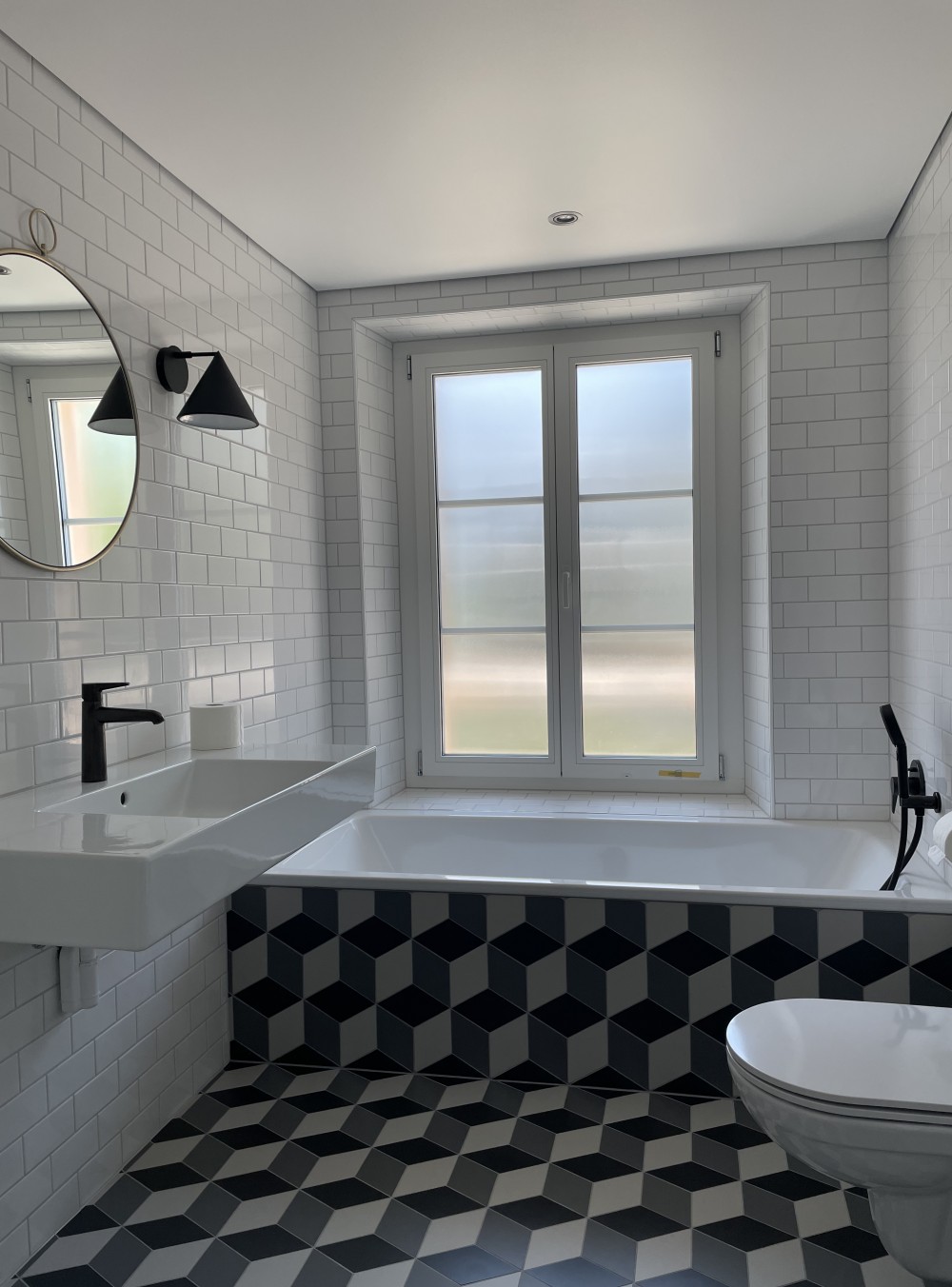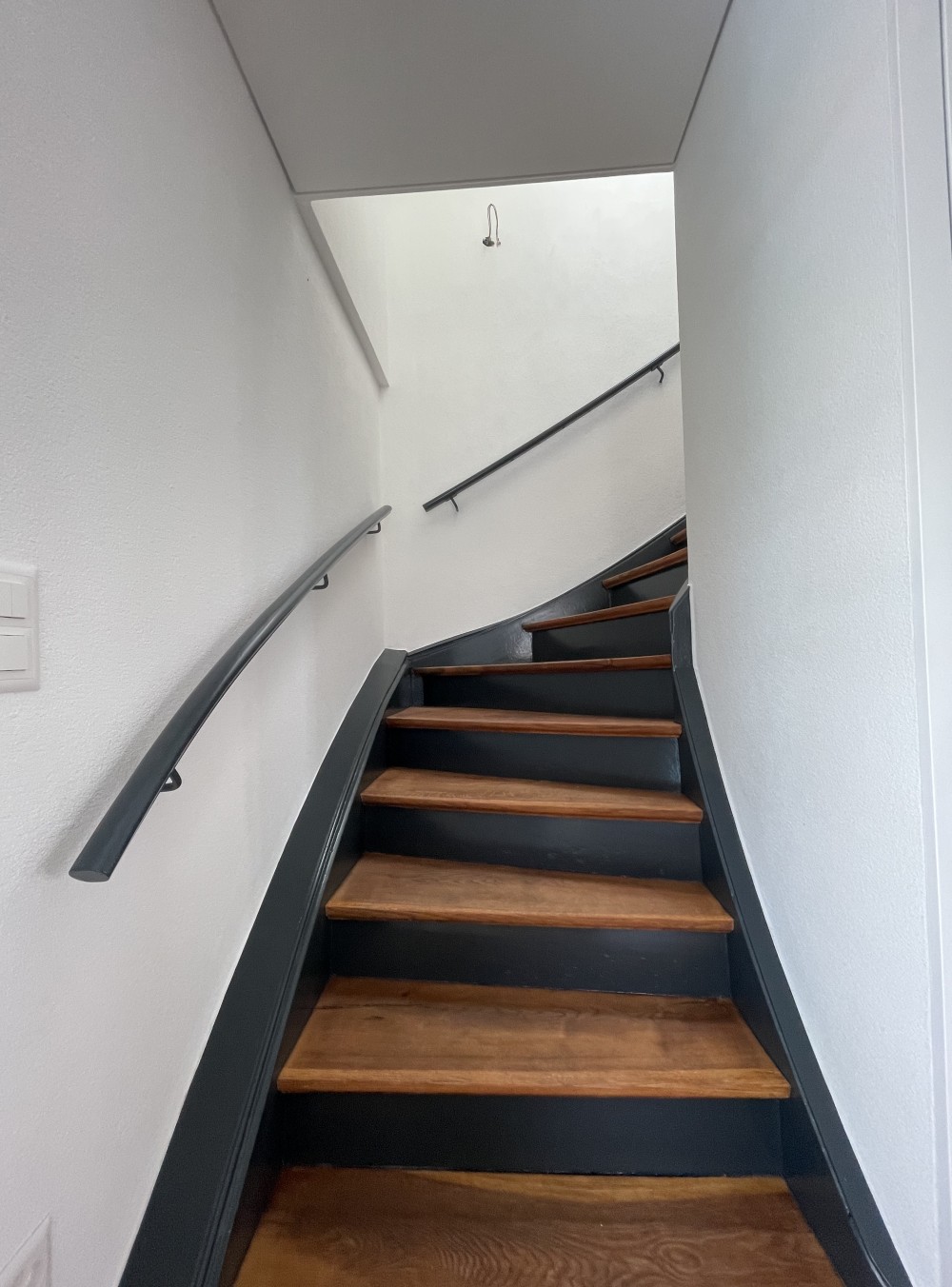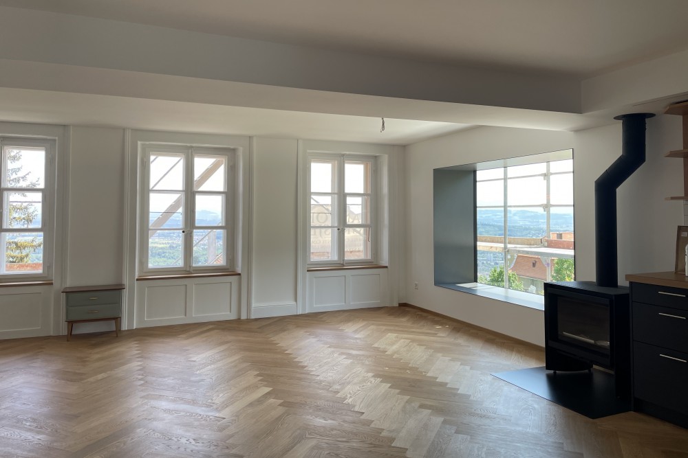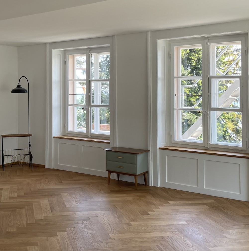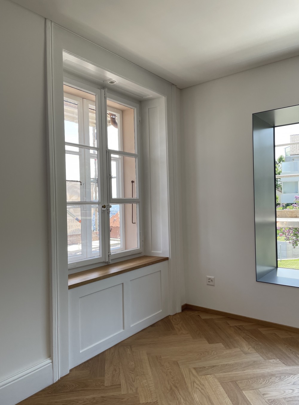 nous avons restructuré le duplex avec au 1er étage la zone séjour et cuisine et une salle de bain. cet espace s’ouvre sur une terrasse au nord du bâtiment. les magnifiques anciennes doubles fenêtres de la façade sud ont été conservées. un grand vitrage affleurant à la façade a été ouvert sur l’ouest afin d’amener de la lumière et d’agrandir visuellement l’espace vie. cette intervention contemporaine et marquante a été validée après discussion avec le service de protection du patrimoine du jura-bernois.