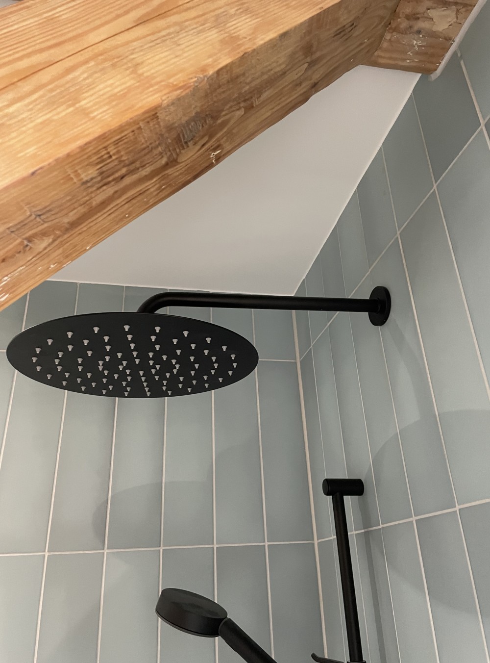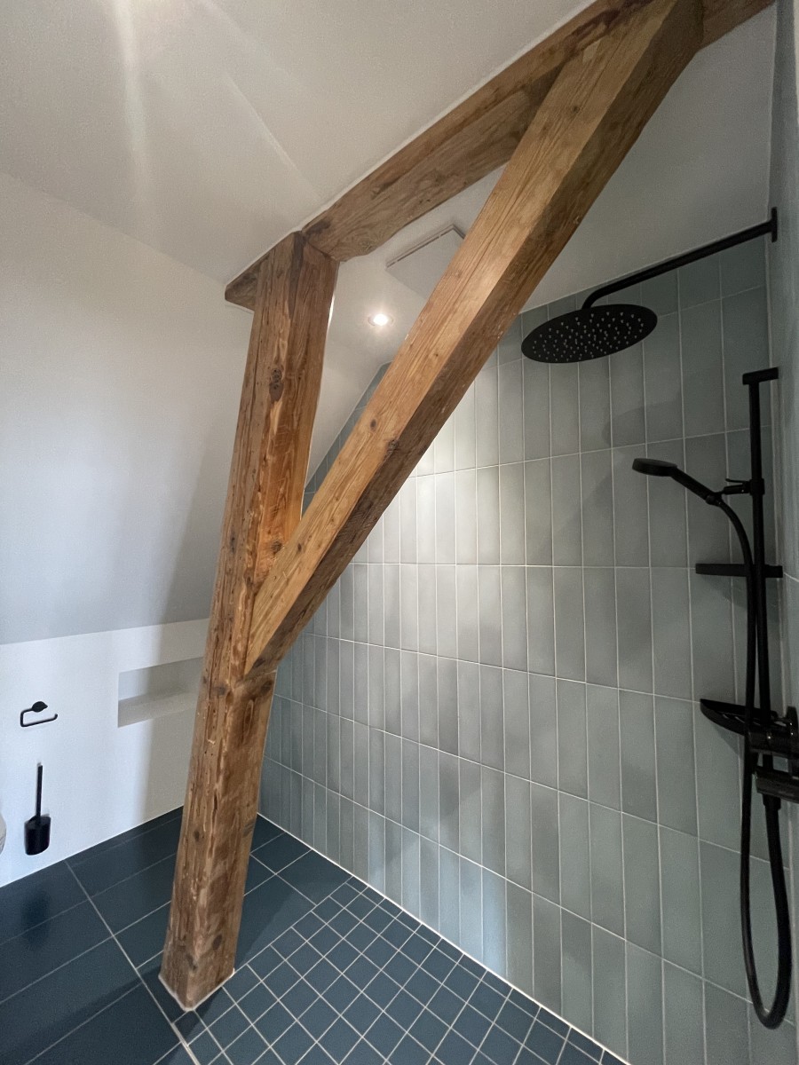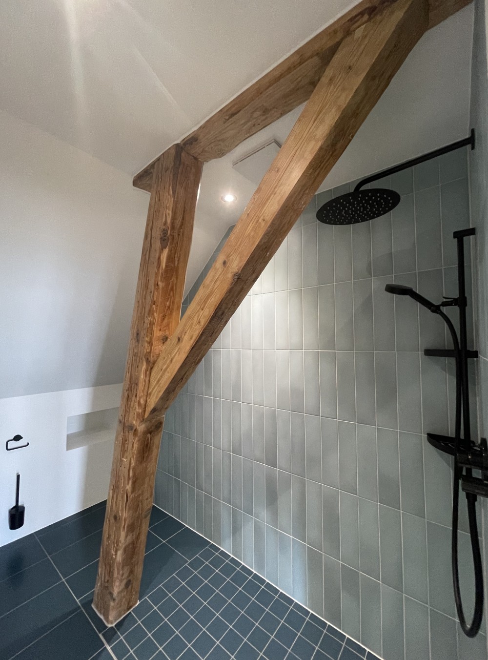 à l’étage des combles, 3 chambres ont été aménagées avec une salle de bain. nous avons dynamisé la surface disponible assez réduite au moyen d’une diagonale qui donne de la profondeur aux chambres.