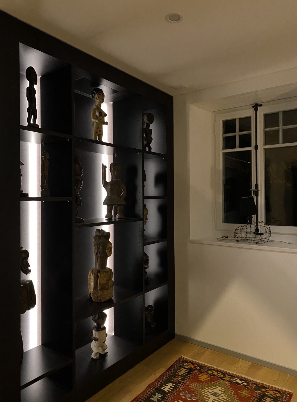 le hall a été aménagé avec quelques éléments de menuiserie et bibliothèque. la salle d’eau a été totalement revue. elle avait subi une première transformation dans les années 80, donc rien n’a été conservé de ce qui aurait pu subsister de la réalisation d’origine