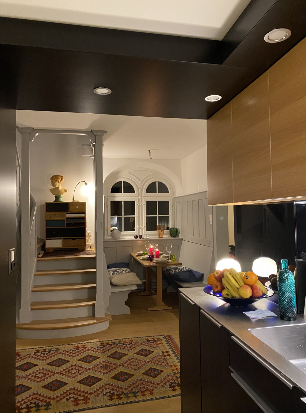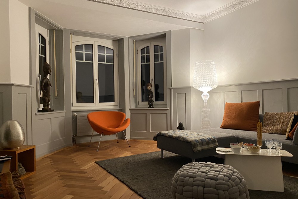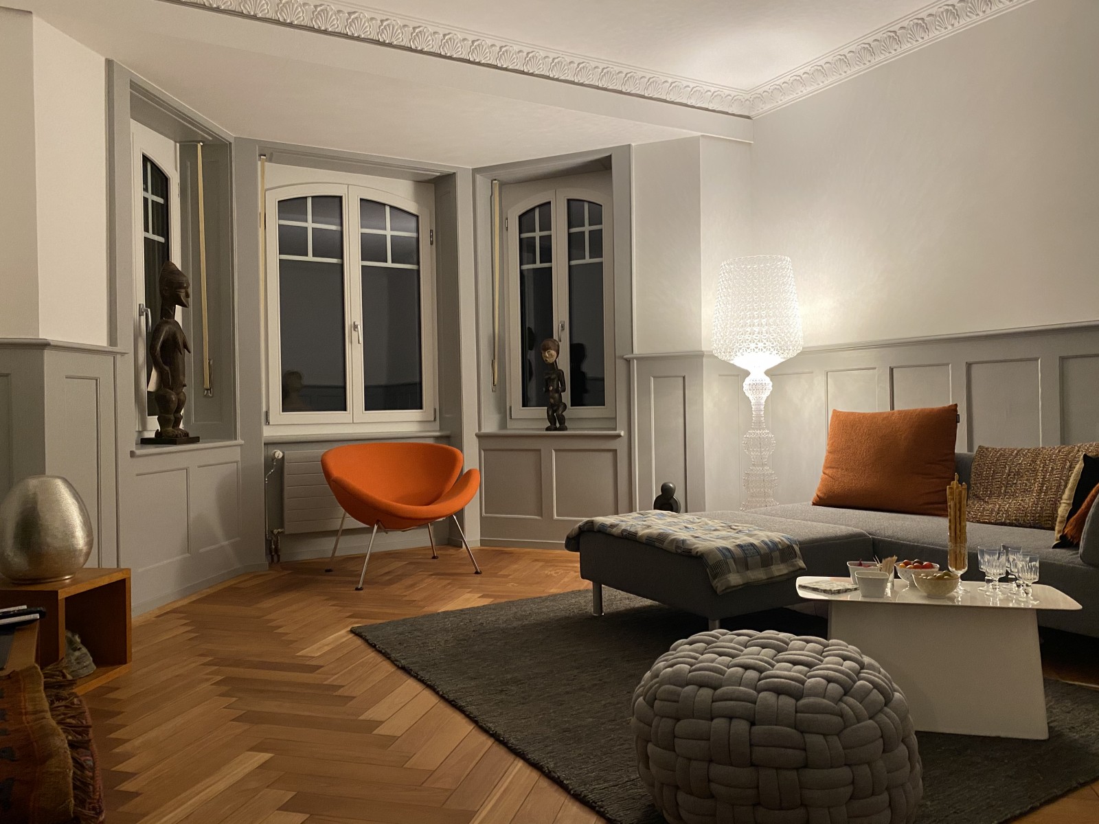 le thème couleur avec le blanc des murs et des plafonds, le gris des boiseries, le chêne des sols et partiellement de la cuisine et des interventions de menuiserie en mdf teinté noir dans la masse a été utilisé sur tous les étages afin de garantir une unité et un fil conducteur.