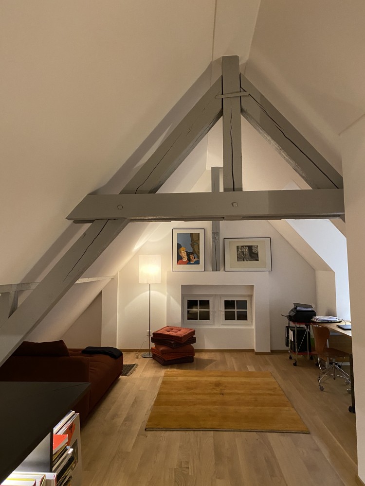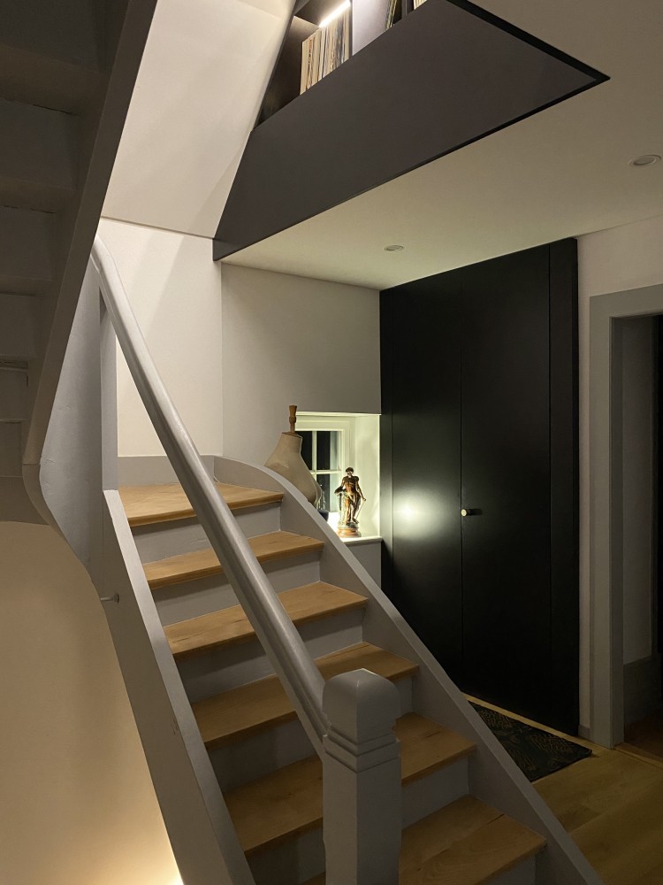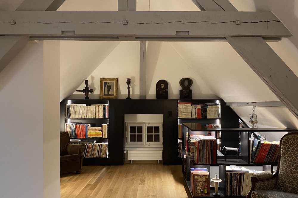 les combles ont été totalement revues, mais sans ajouter d’ouvertures à celles existantes. le volume a été ouvert totalement jusqu’au faîte. le sol en chêne, la menuiserie en mdf noir avec des éclairages indirects intégrés, les pans de toiture revêtus de panneaux lissés blancs et les éléments importants de la charpente peints en gris apportent à cet espace une qualité indéniable pour en faire un endroit de travail ou de cocooning