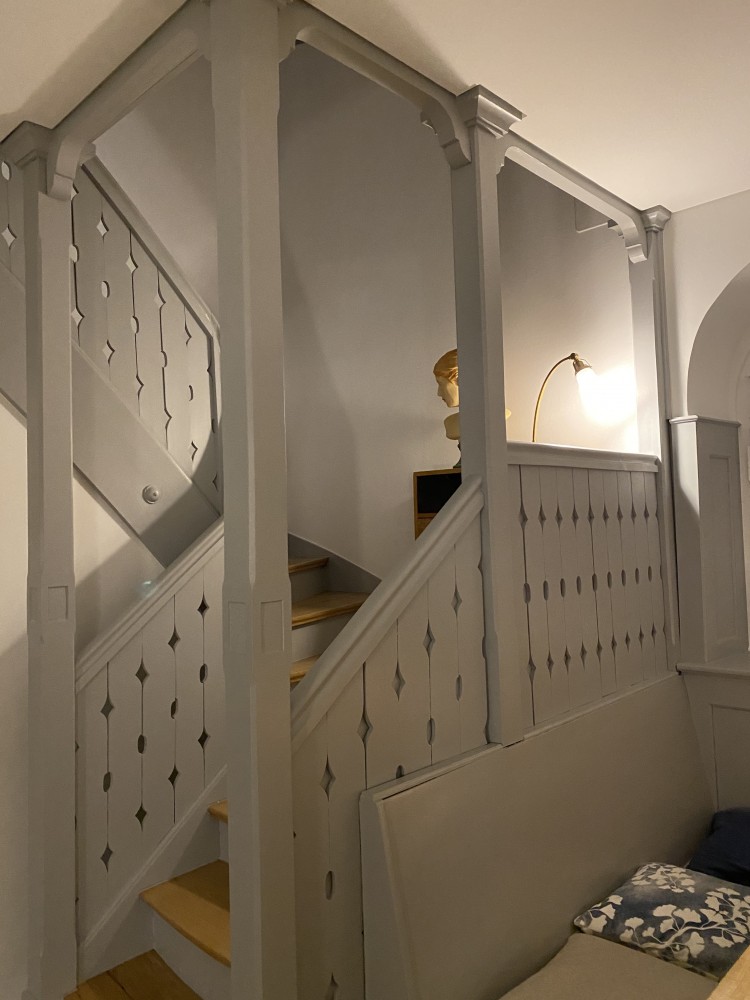 le rez-de-chaussée avant les travaux était conçu selon une disposition typique de l’époque, avec entrée par un sas au nord, une cuisine fermée au nord-ouest, une petite chambre et « la belle chambre » au sud, le tout distribué depuis un hall faisant office de coin à manger et d’accès à l’escalier demi-tournant menant aux étages. cette structure a été conservée avec les travaux entrepris. seule la cuisine a été partiellement ouverte sur le hall afin de mieux répondre aux attentes d’aujourd’hui et d’amener de la lumière dans le cœur de la maison. le vieux parquet de chêne posé en fougère de la belle chambre a été conservé, ainsi que toutes les boiseries et les stucs au plafond. dans les autres pièces déjà maintes fois rénovées, le parti a été pris de faire des nouveaux faux-plafonds lisses et blanc et de mettre des nouveaux sols en chêne et/ou carrelage. le hall très sombre avec ses boiseries foncées et autres tapisseries a passé d’un aspect un peu lugubre et « maison hantée » à un magnifique espace de rencontre lumineux.