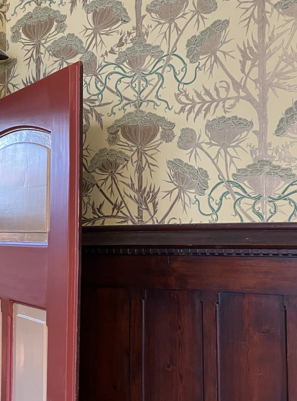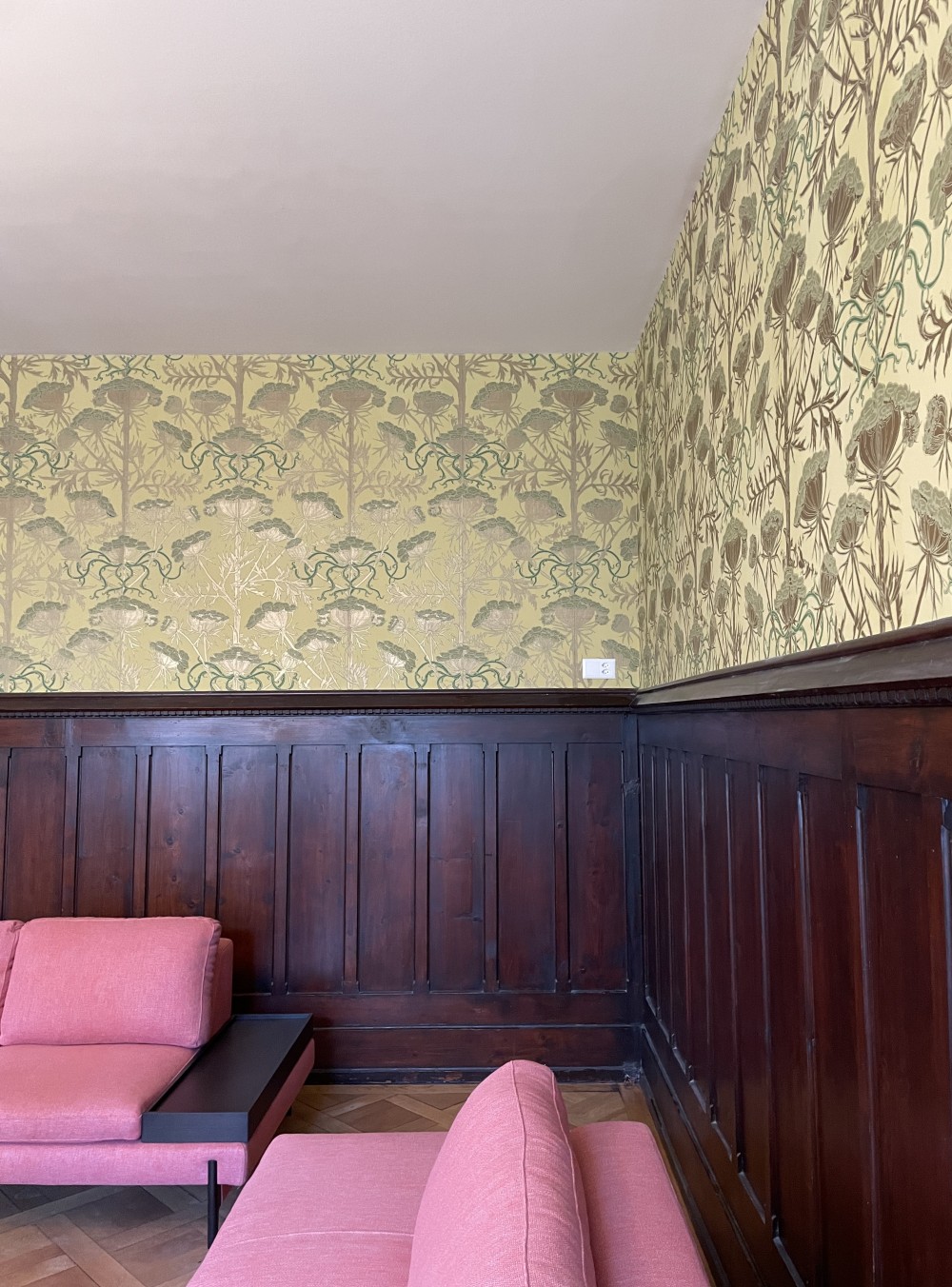 les surfaces de parois de la cage d’escalier et celle du couloir de distribution du 1er étage, revêtues d’un enduit synthétique ribé ont été lissées au moyen d’un enduit minéral puis surpeintes à l’aide d’une peinture minérale selon le concept couleur défini. les surfaces de murs des zones de circulation et des chambres majoritairement recouvertes de tapisserie de type ingrain ont été mises à jour, lissées au moyen d’un enduit minéral puis surpeintes à l’aide d’une peinture minérale selon le concept couleur défini. les surfaces de mur de l’arche encadrant l’accès à l’oriel sud-est ont été mises à jour, révélant la suite du décor peint de l’oriel. ces éléments décoratifs ont été conservés et restaurés. les surfaces de mur surplombant le lambrissage de socle du grand salon du 1er étage ont été mises à jour, lissées au moyen d’un enduit minéral puis recouvertes d’un papier peint contemporain s’inspirant d’un modèle historique s’harmonisant avec le concept couleur défini.