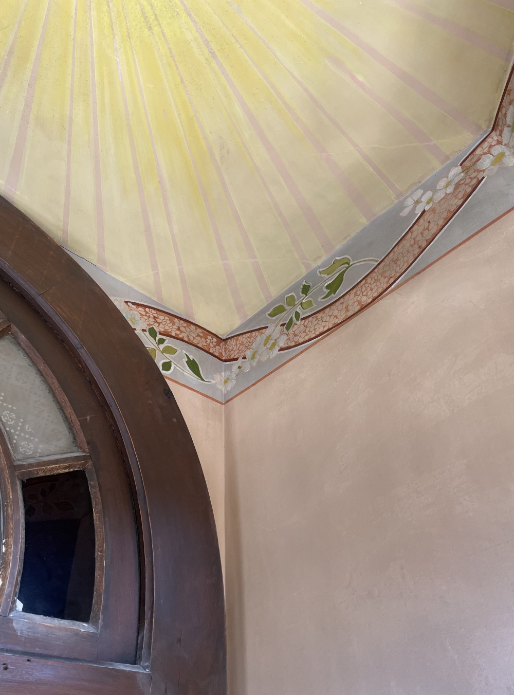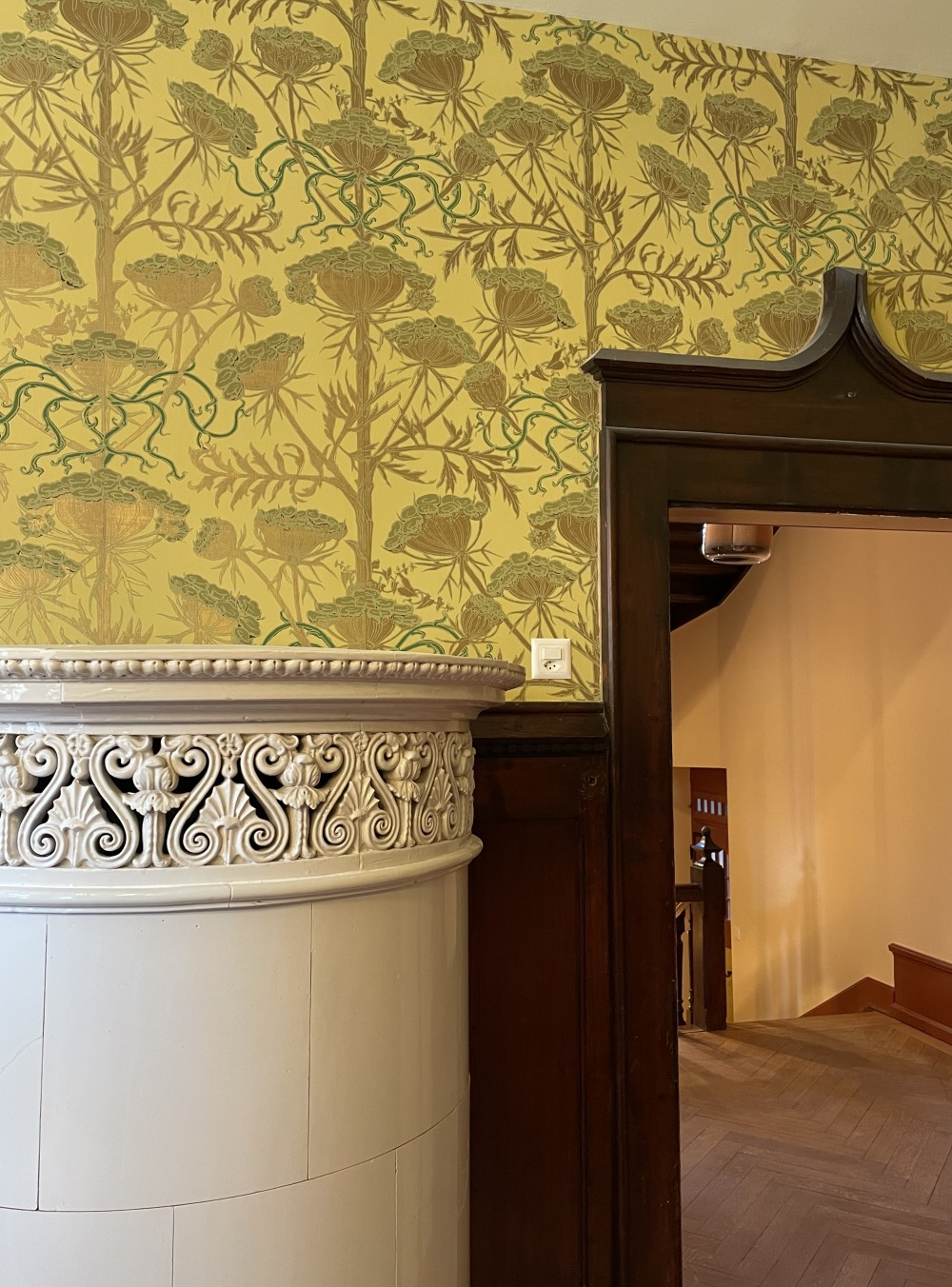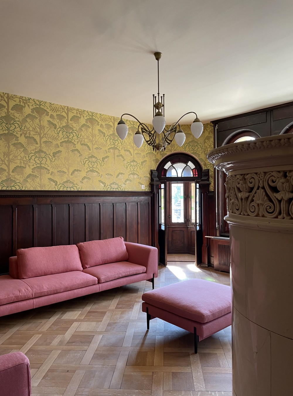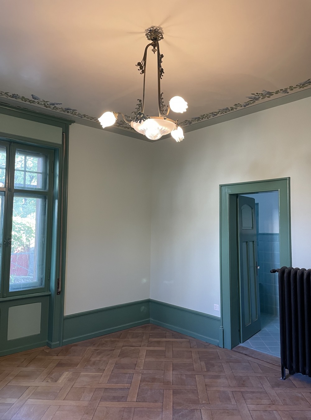 les surfaces de murs revêtues d’un enduit ribé synthétique pourraient être lissées au moyen d’un enduit à base de plâtre puis surpeintes selon le concept couleur défini au moyen d’une peinture intérieure mate sans composants synthétiques. idéalement, les lés de tapisserie moderne présents au niveau des murs et des plafonds devraient être éliminés, les surfaces concernées rhabillées puis surpeintes selon le concept couleur défini au moyen d’une peinture intérieure mate sans composants synthétiques.