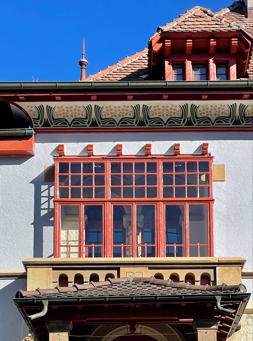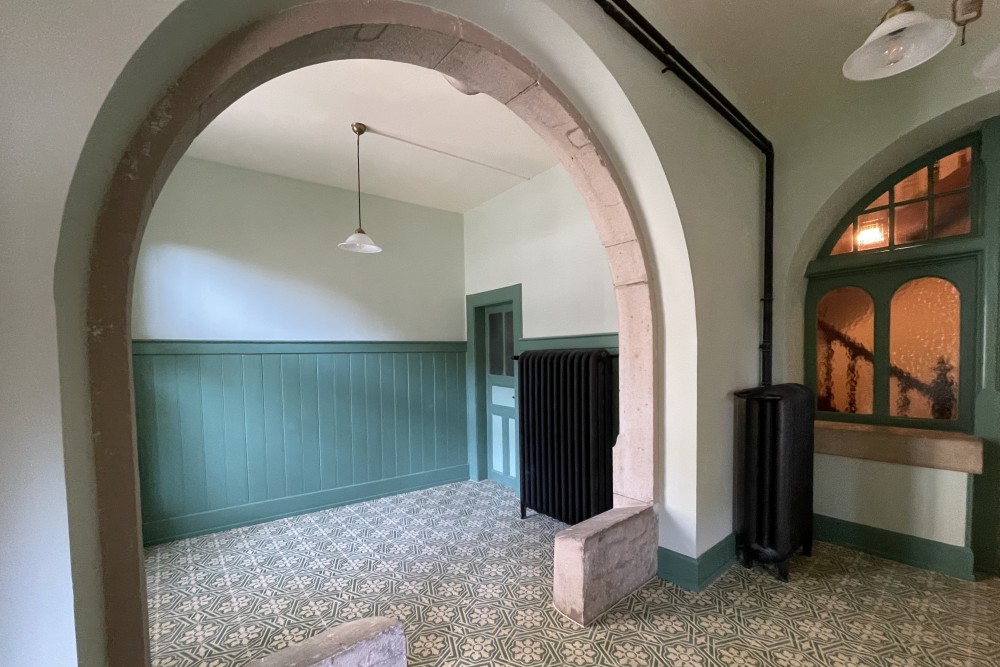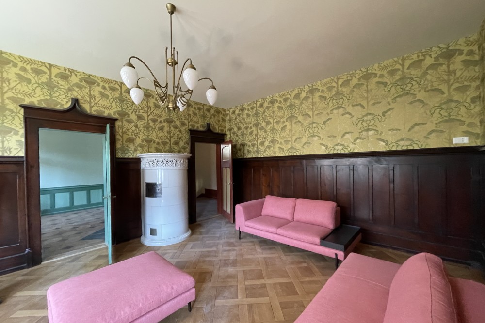 remarquable villa de deux étages, érigée au début du 20e siècle mêlant divers styles historicisants allant du moyen-âge à l’art nouveau en passant par la renaissance. l’accès principal aux volumes intérieurs est réalisé en façade sud par le biais d’un vestibule d’entrée qui comporte un arc en plein cintre monumental ouvert en direction de l’ouest, une paroi de séparation vitrée en bois mouluré vers le nord ainsi qu’une porte de facture récente donnant accès aux trois chambres situées au rez-de-chaussée est. le sol du vestibule est recouvert d’un carrelage en céramique, les murs et plafonds sont revêtus d’une tapisserie ingrain peinte à la dispersion, éléments mis en place lors d’une intervention contemporaine.