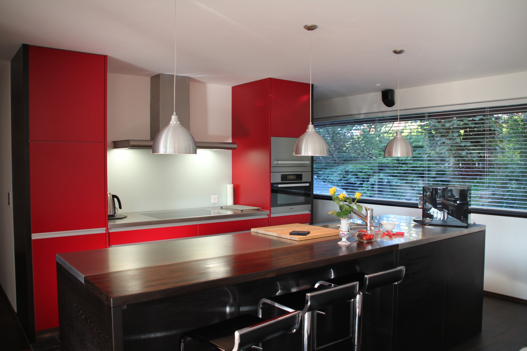 l'ardoise anthracite des sols des salles d'eau et des murs, le ton chaud du chêne fumé des parquets et de certains éléments de menuiserie, le rouge laqué de la cuisine, l'inox brossé des plans de travail, les nouveaux vitrages anthracites, mais aussi et surtout les murs et plafonds totalement lissés permettant, grâce à l'absence de structure, à l'œil de percevoir les espace plus généreusement, sont autant d'éléments qui ont redonné à cette villa une dimension nouvelle.