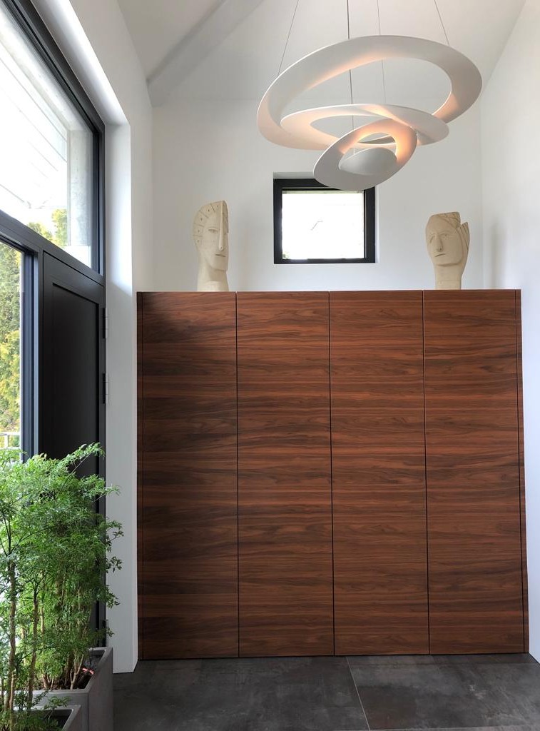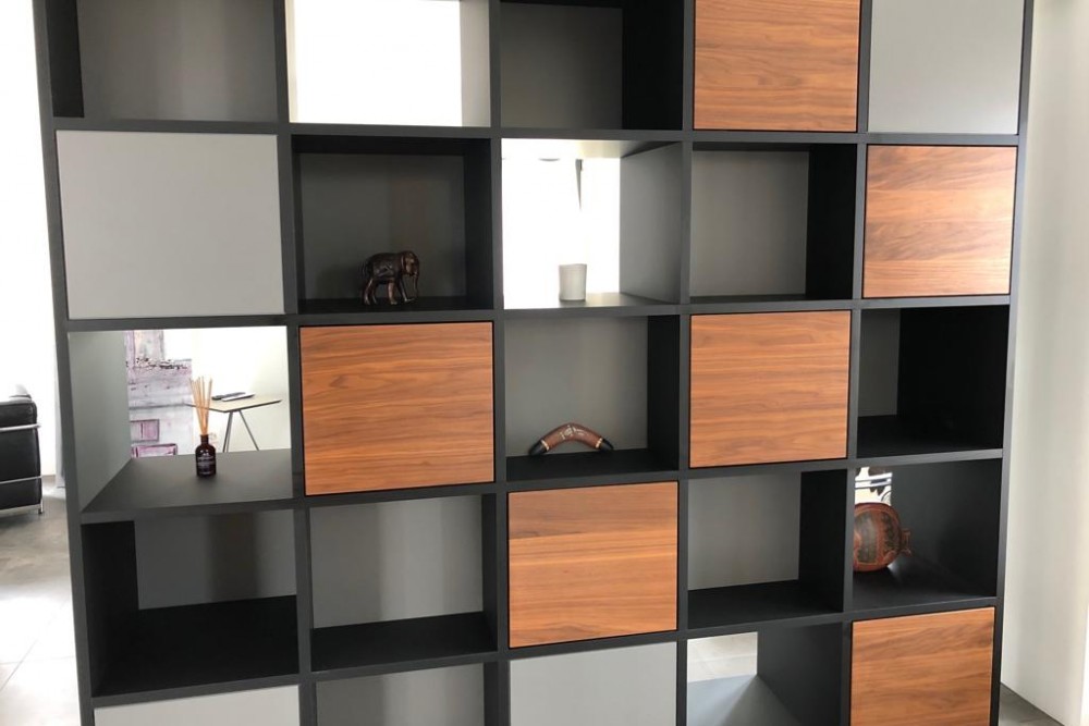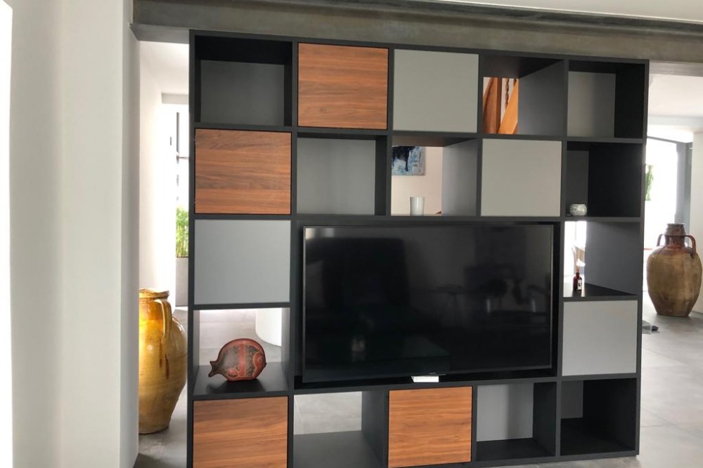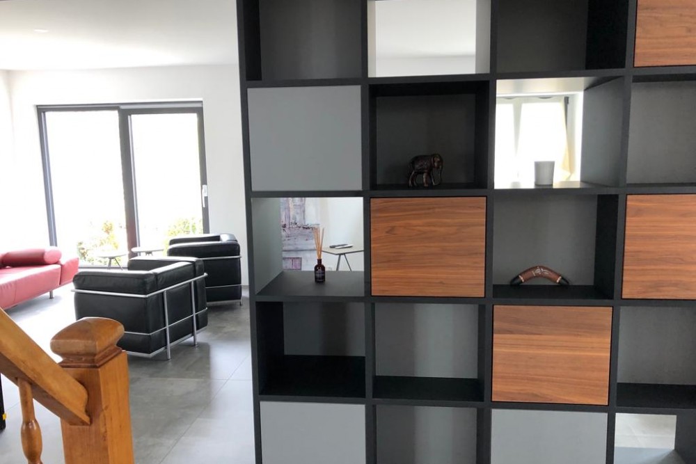 divers éléments de menuiserie intérieure reprenant le stratifié noir et le noyer américain viennent cloisonner et structurer les différentes zones que sont l’entrée, le coin séjour, le coin tv, la zone manger et la cuisine. une grande étagère crée par exemple un filtre entre le hall d’entrée et le coin tv, au moyen de casiers ouverts, semi-ouverts ou fermés, permettant de ranger ou d’entreposer des objets de décoration.