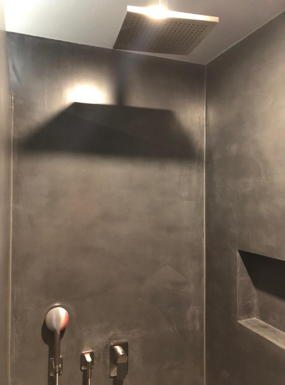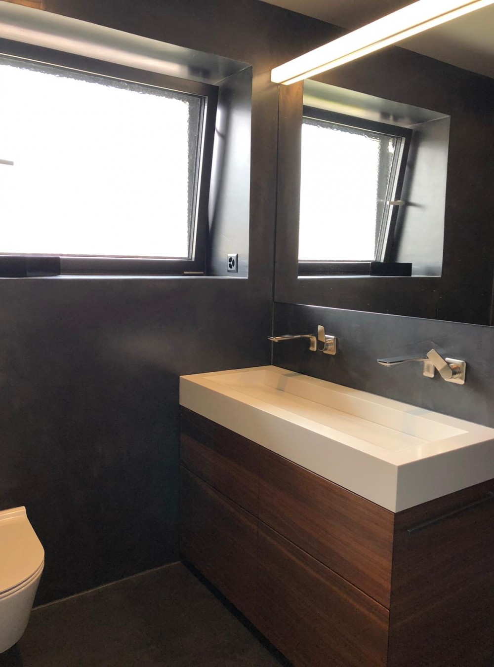 une nouvelle cuisine en stratifié noir et noyer américain a été repositionnée afin de créer un élément bar, ouvert sur la salle à manger. tous les sols ont été unifiés au travers d’un nouveau carrelage de grandes dimensions dans les tons brun-anthracite, alors que tous les murs et les plafonds ont été lissés et peints en blanc.
