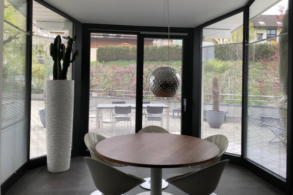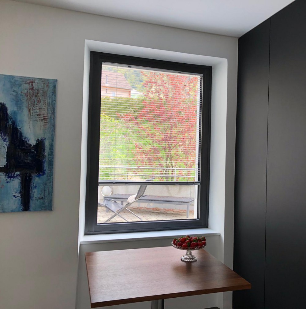 ainsi toutes les fenêtres et les baies vitrées existantes ont été remplacées ou agrandies. les ouvertures d’origine ont été traitées en fenêtres bois-métal à 2 vantaux, alors que les nouvelles ouvertures ont été traitées en aluminium thermolaqué anthracite.