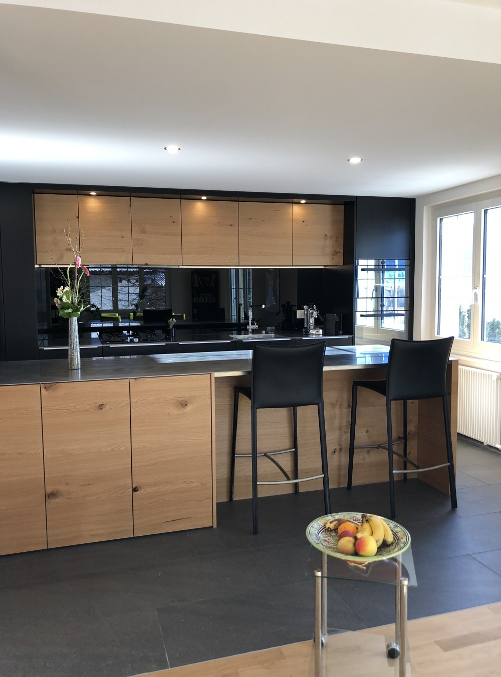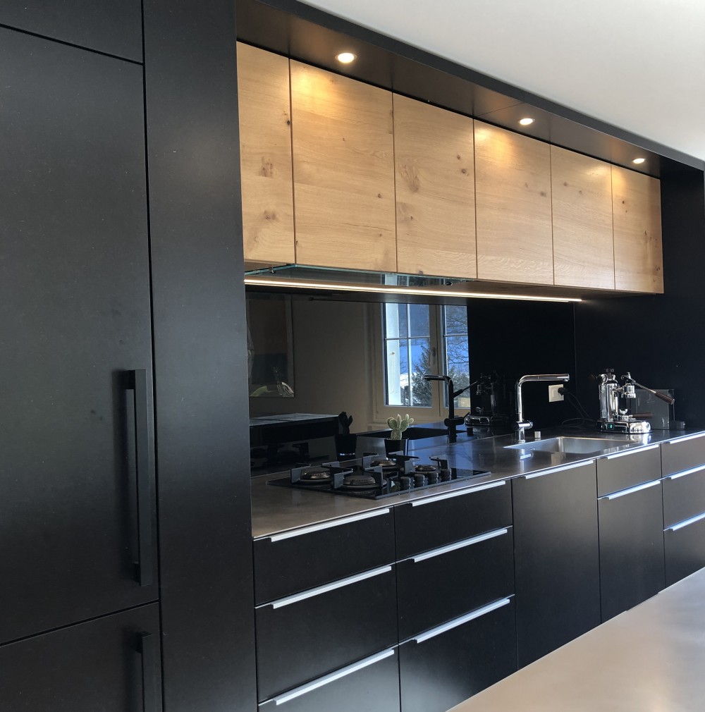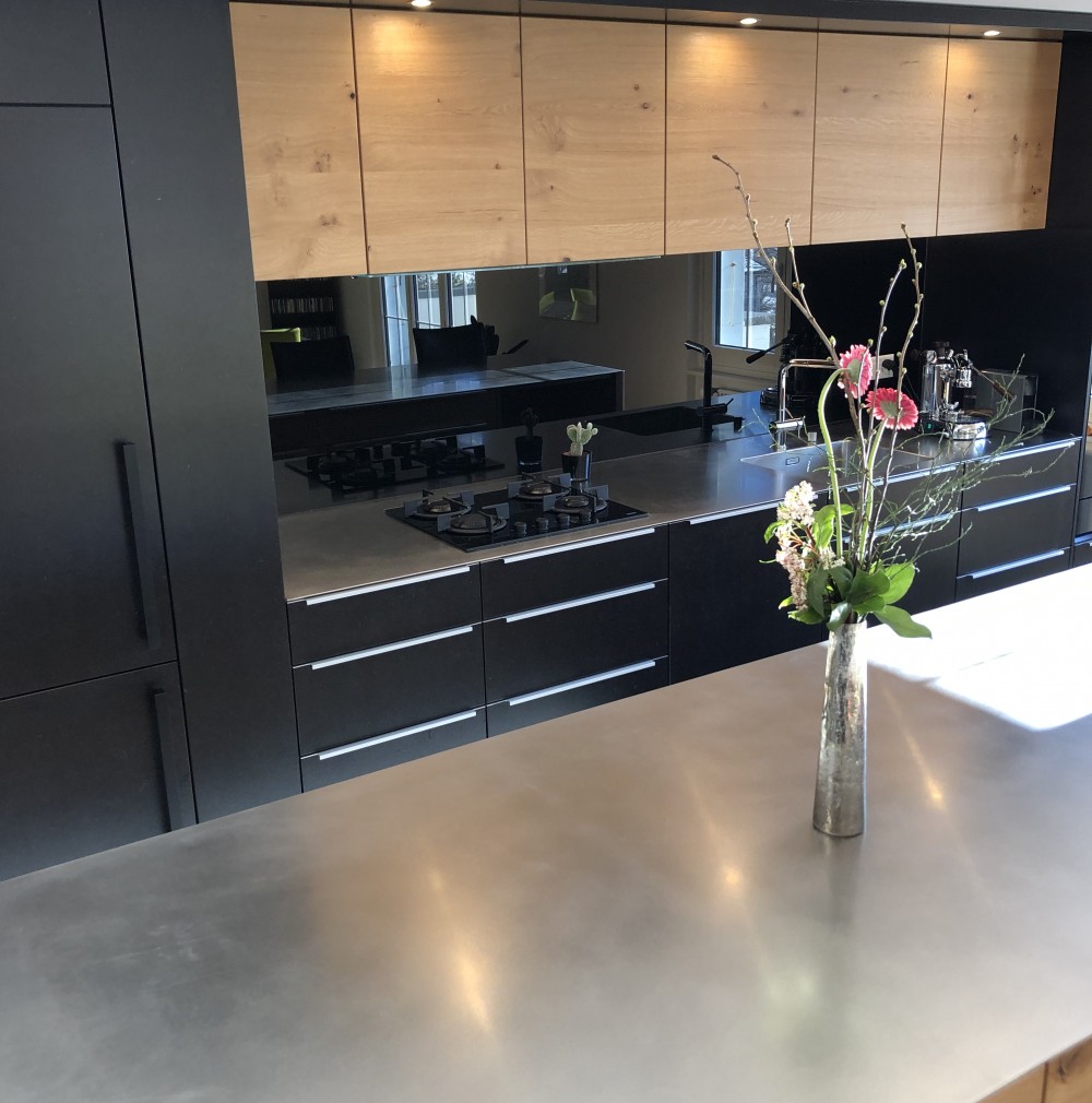 les sols sont en en gré-cérame anthracite façon terrazzo. les murs et plafonds et faux-plafonds sont blancs lisses, les éléments de menuiserie et la cuisine sont en panneaux de particules mdf noir teinté dans masse, avec des partie en chêne clair pour la cuisine. le séjour est également revêtu d’un parquet en chêne clair. des plateaux inox forment les surfaces de travail de la cuisine et de l’ilot central devenu le cœur de la maison.