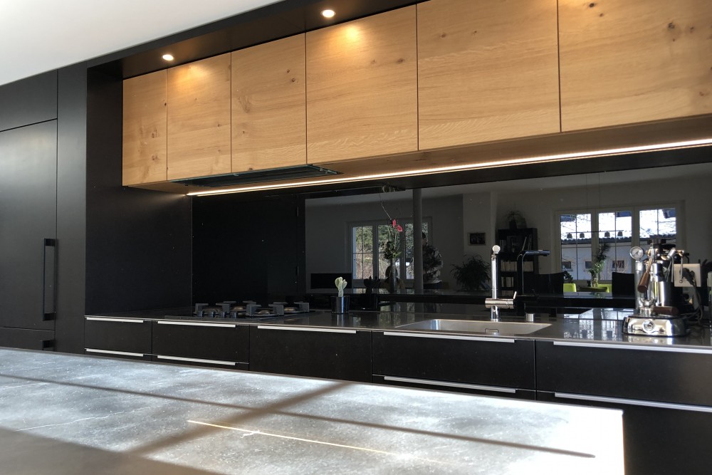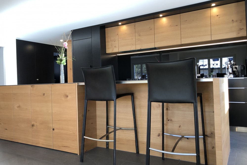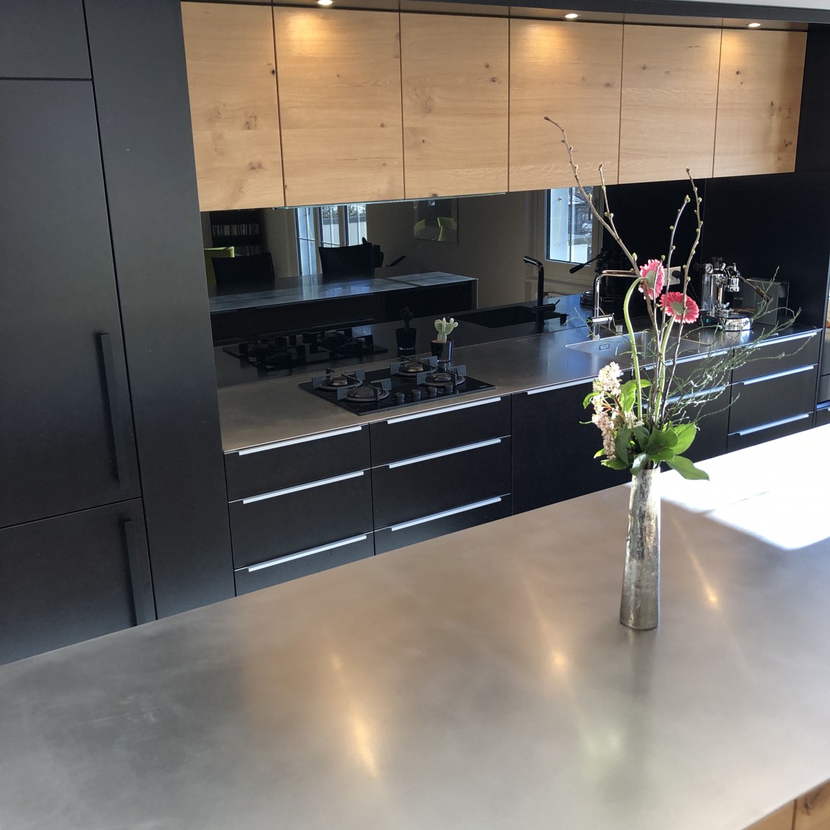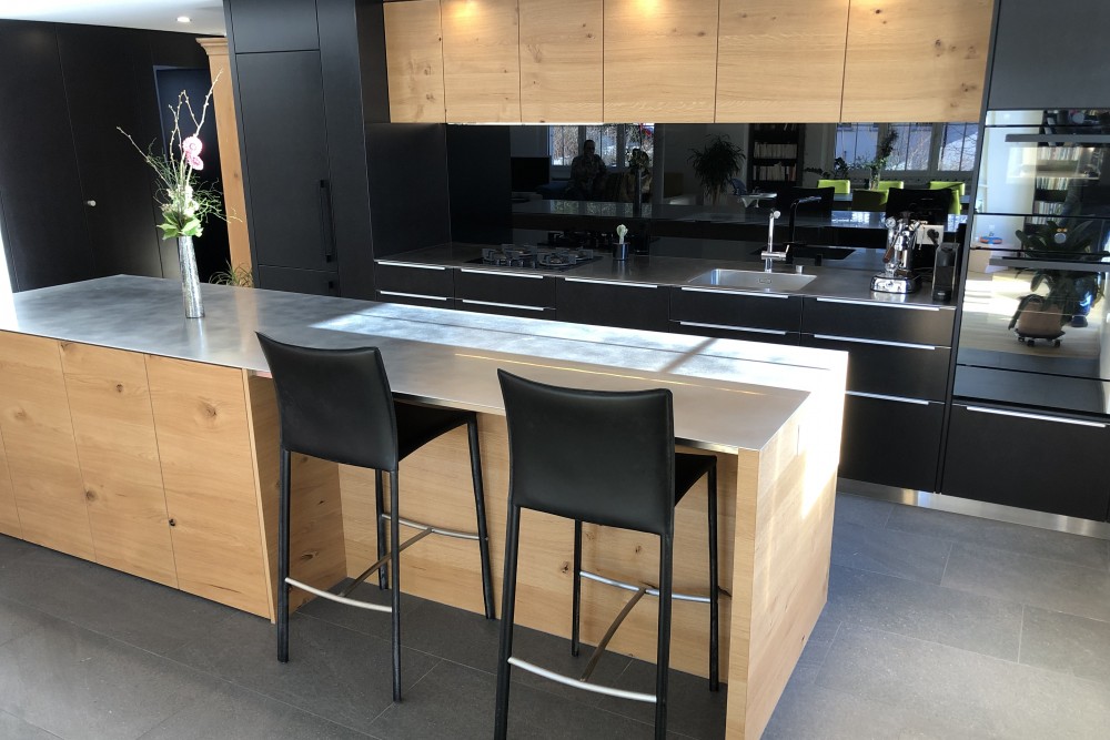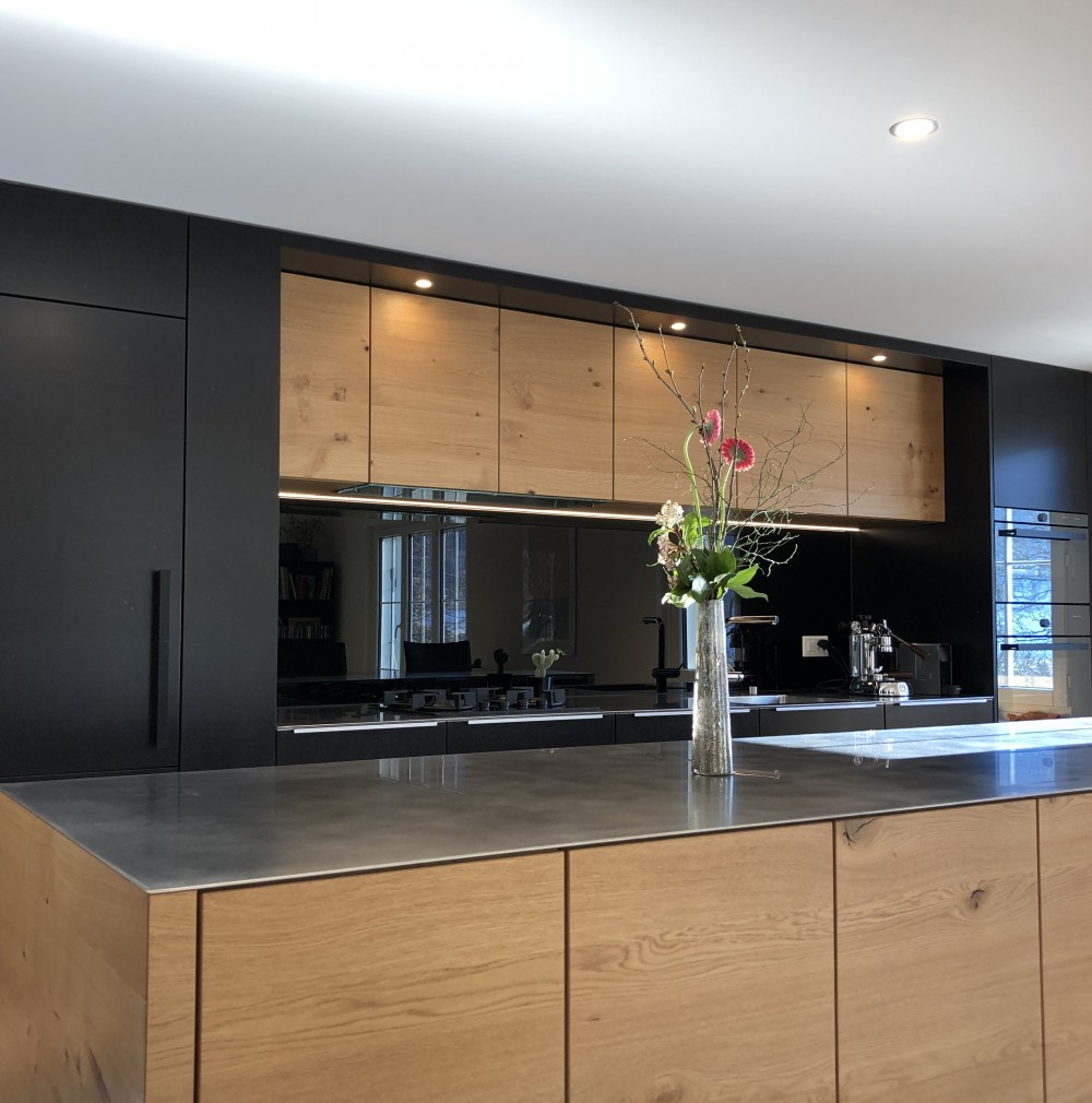 les sols sont en en gré-cérame anthracite façon terrazzo. les murs et plafonds et faux-plafonds sont blancs lisses, les éléments de menuiserie et la cuisine sont en panneaux de particules mdf noir teinté dans masse, avec des partie en chêne clair pour la cuisine. le séjour est également revêtu d’un parquet en chêne clair. des plateaux inox forment les surfaces de travail de la cuisine et de l’ilot central devenu le cœur de la maison.