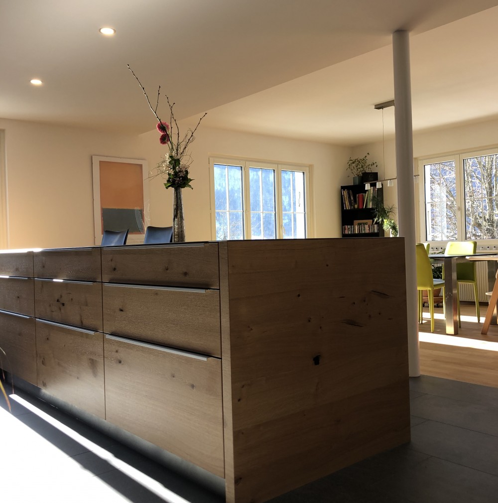 la cuisine a été déplacée au sud, et les espaces vies ont été totalement ouverts afin d’offrir du volume et de la surface. seule une chambre a été conservée comme chambre parentale, ou comme pièce de vie, travail et bureau. une nouvelle salle de bain a été aménagée dans l’ancienne cuisine et l’ancienne salle de bain a été revitalisée pour en faire des wc de service.