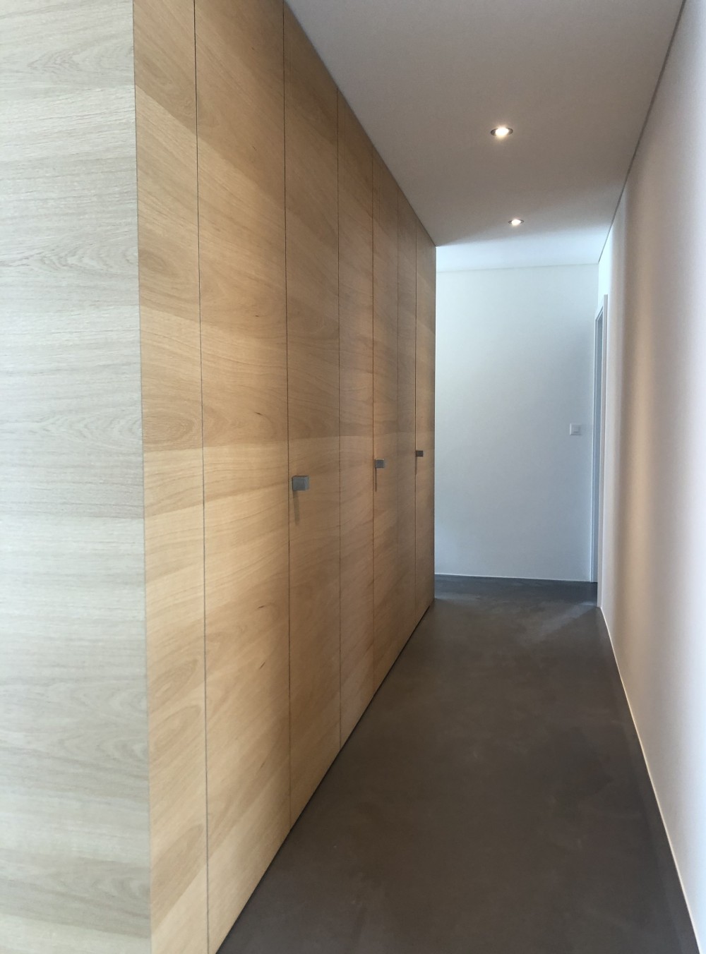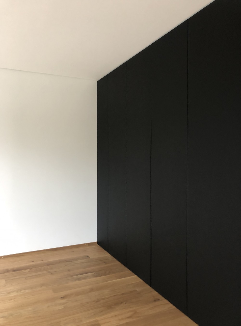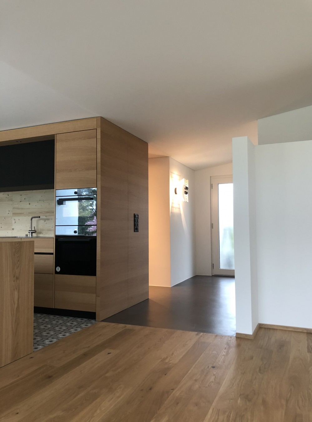 tous les murs ont été lissés et de manière générale peints en blanc. le bois de chêne a été retenu pour les sols en parquet et pour la cuisine, en accord avec certaines parties en stratifié « phoenix »noir.