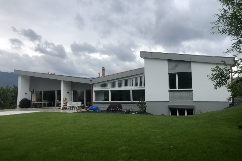 le patrimoine bernois, qui avait fait opposition à divers projets de rénovation avant que notre bureau reprenne le dossier, a accepté sans réticences notre proposition, qui a consisté un agrandissement de la villa avec un prolongement d’un seul côté de la « toiture papillon » existante. il a été décidé, en raison de la volumétrie très particulière de cette villa, de se poser la question de ce qui aurait été fait pour faire la maison plus grande dès son origine, plutôt que de marquer l’agrandissement avec une adjonction « 2020 ». une personne novice ne peut donc pas savoir comment était la villa avant les travaux d’agrandissement. et honnêtement, au regard de la façade sud sur le jardin, nous constatons même que les nouvelles proportions sont plus équilibrées que les proportions d’origine.