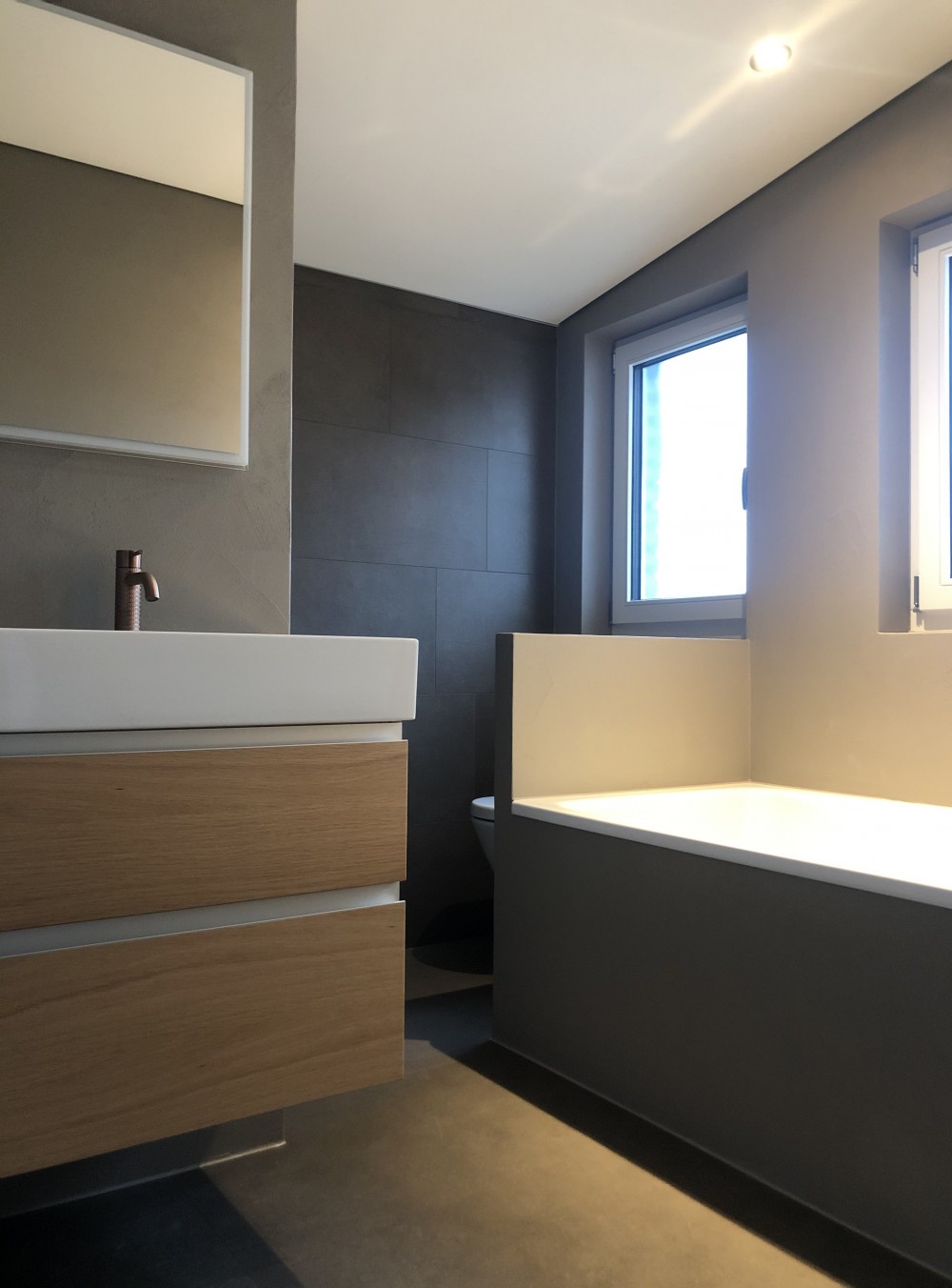 certains sols, dont principalement les circulations et les sanitaires, ont été revêtus d’un revêtement en fine couche type « Kerakoll ». le sol de la cuisine est en carreaux de ciments colorés.