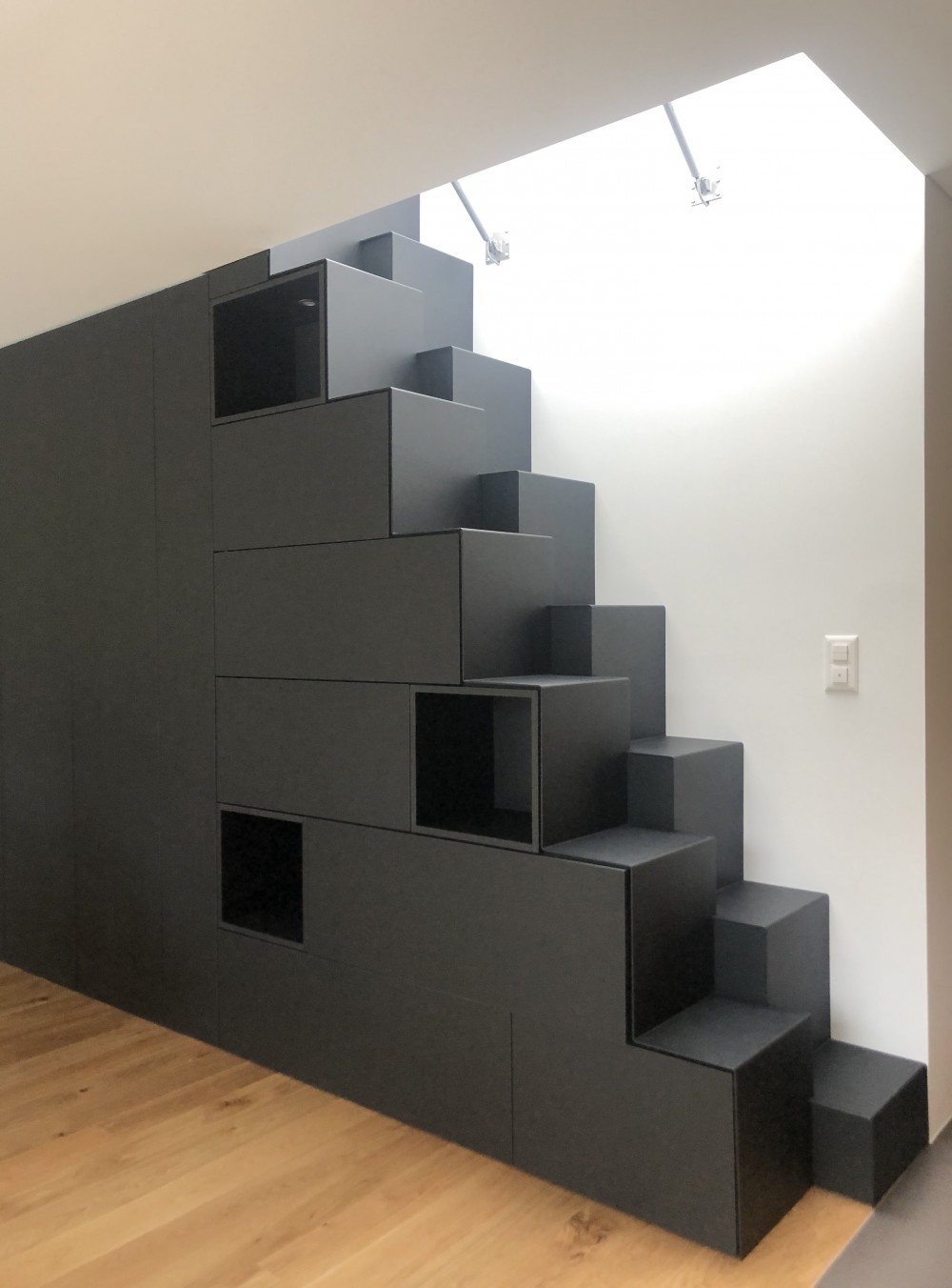 le niveau vie accueil l’entrée principale, un wc de service un immense séjour ouvert jusqu’en toiture, la cuisine, la salle à manger et la double suite parentale avec dressing et salle de bain. ce programme généreux a été rendu possible grâce à l’agrandissement réalisé dans le prolongement de ce qui existait. depuis la salle à manger, un escalier « samba » intégré au mobilier mène à une trappe de toiture vitrée et motorisée qui donne accès à la terrasse de toiture à la manière d’un « balcon baignoire » dans la toiture papillon.