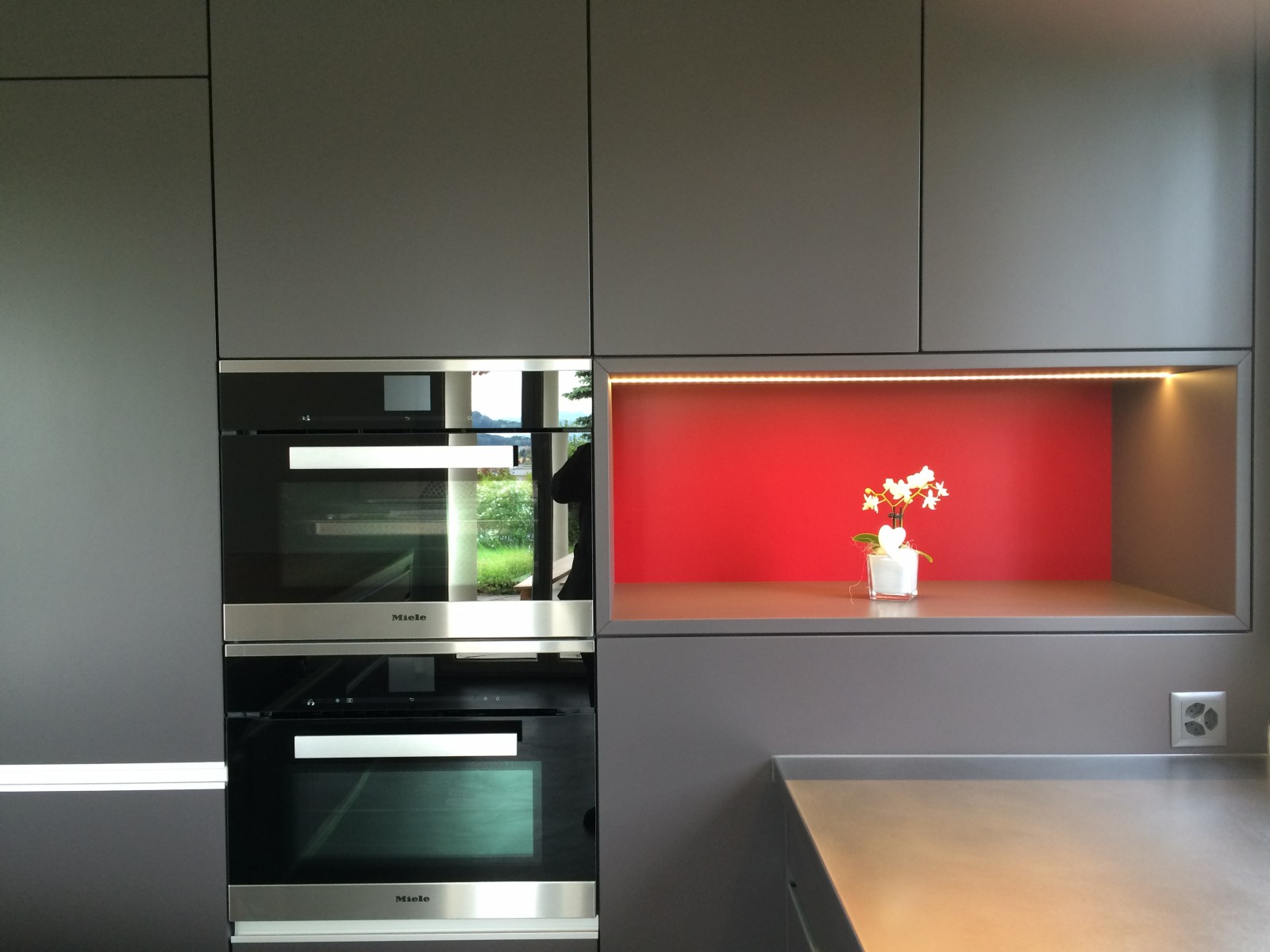 au rez-de-chaussée, le séjour a été traité avec un parquet de chêne fumé. l'espace cuisine ainsi que la cage d'escalier, le wc de service et le hall ont été traités avec un béton ciré de couleur anthracite avec une touche de rouge ce qui lui donne une note de chaleur particulière. la cuisine giclée anthracite se démarque d'une manière assez neutre. une touche de rouge y a été ajoutée dans une niche et au dos du bar, touche de rouge que nous retrouvons sur les armoires du hall d'entrée. un mur violet au rez-de-chaussée et un autre au premier étage apportent une note forte à la cage d'escalier, avec une mise en lumière par de petits luminaires en applique. c'était un vœu de la maîtresse de maison d'avoir de la couleur sur certains murs, et nous avons opté pour travailler avec des couleurs fortes, intenses et lumineuses de manière ponctuelle. au premier étage, nous retrouvons le chêne fumé sur les sols. les salles de bains sont traitées avec une pierre grise rappelant la pierre de vals.
