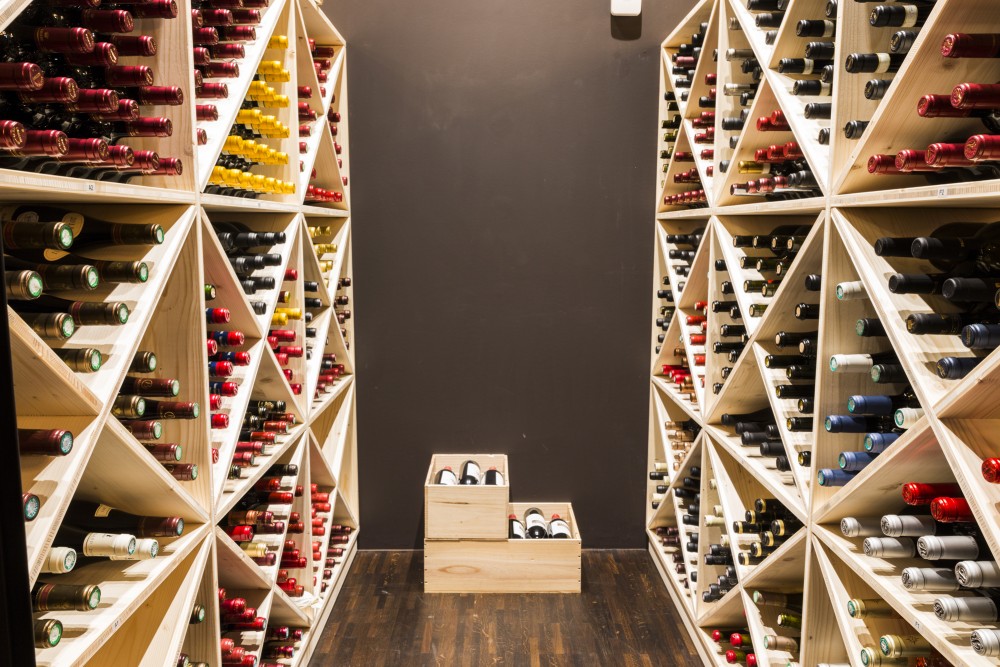 la salle est divisée en deux zones, l’une plutôt classique avec ses tables basses, et l’autre plutôt coin tapas, avec une grande table haute centrale et une vitrine réfrigérée pour la consommation et l’achat de produits frais. le tout est articulé autour de la pièce maîtresse qu’est la cave à vin vitrée. un grand bar vient séparer le côté service du côté salle.