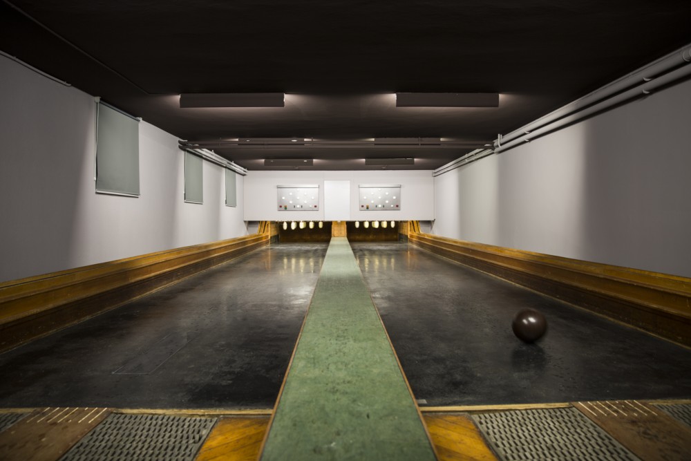 la cuisine se trouve à l’étage inférieur, reliée à la zone service par un ascenseur. un vieux jeu de quilles d’époque se trouve également à l’étage inférieur, dans une seconde salle que peuvent utiliser les clients pour un apéro ou une séance en privé, en profitant de lancer quelques boules.