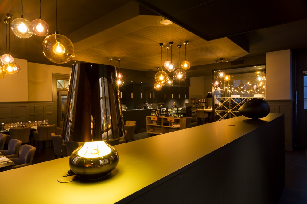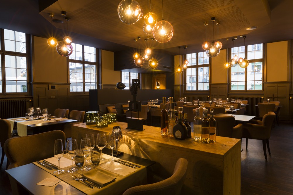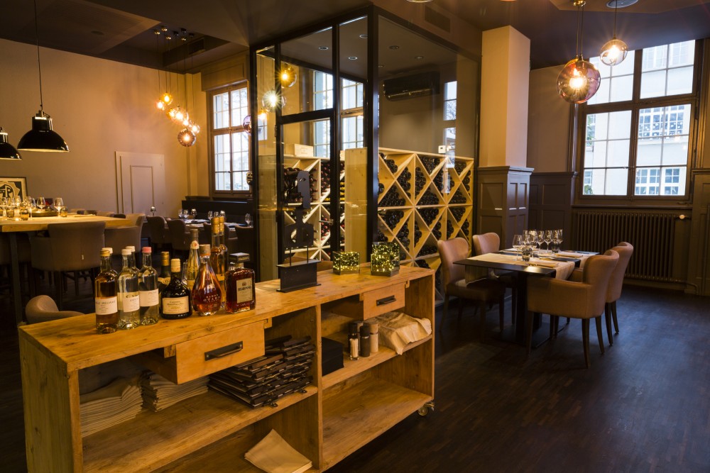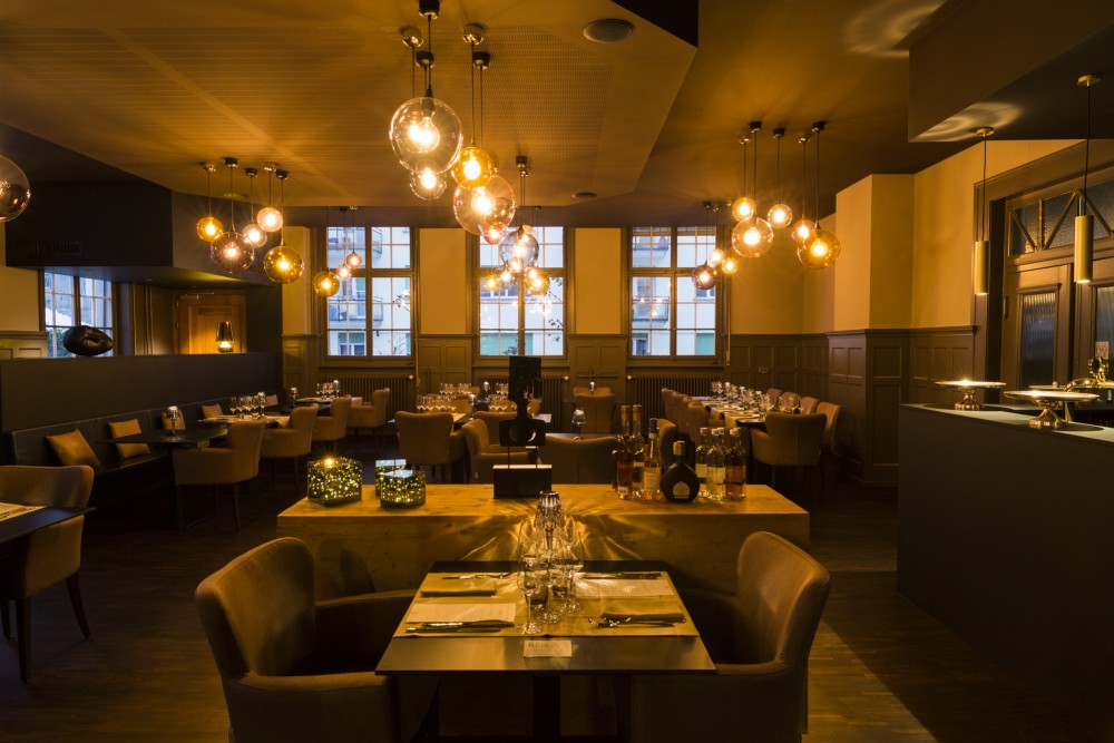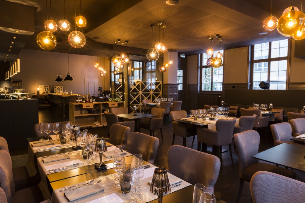 les espaces ont été ouverts, les grandes hauteurs mises en valeur, les vieilles boiseries soulignées et le charme et la noblesse de cette ancienne bâtisse remis en avant. le tout a été travaillé dans des tons gris chauds, anthracite et noir, pour mettre en valeur les décorations et le mobilier, et finalement pour mettre au premier plan ce qui doit l’être avant tout: la nourriture.