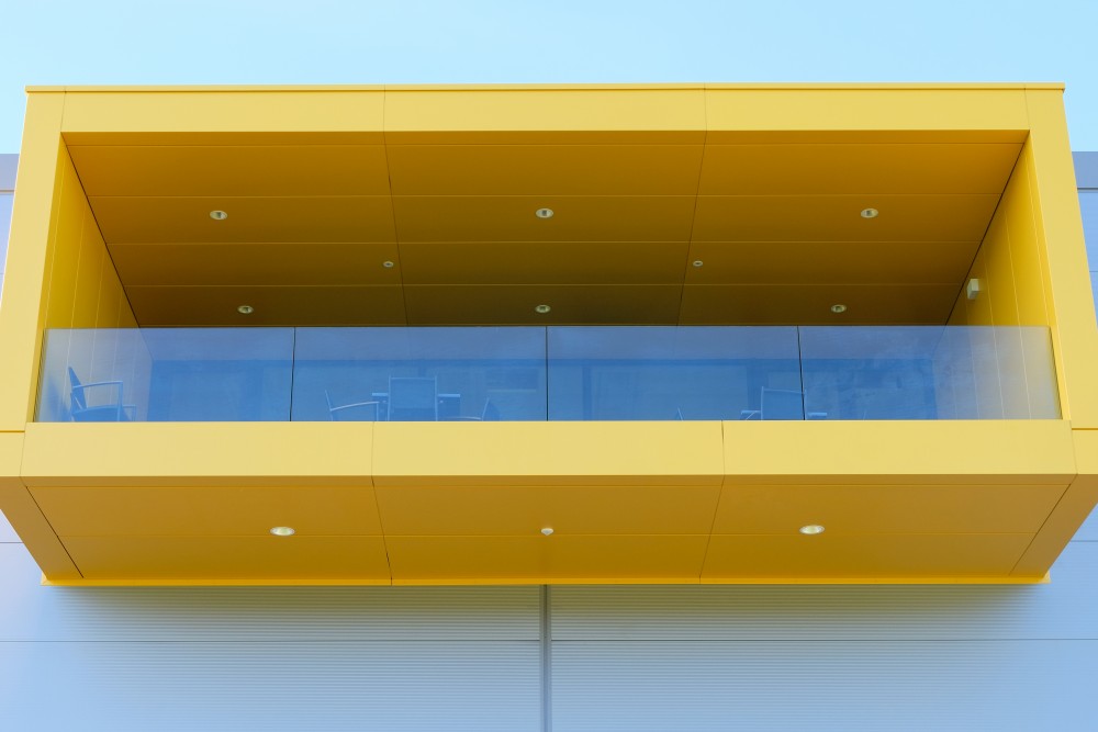 en toiture, les monoblocs sont placés derrière un écran visuel (tôles perforées). le reste de la surface à disposition sera composé de panneaux photovoltaïques.