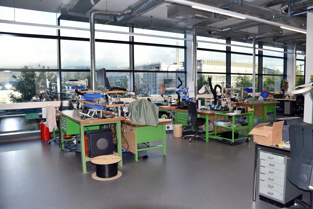 le bâtiment s’organise sur 3 niveaux. le rez-de-chaussée accueille tout la partie réception (administration) de même que des surfaces de stockage, d’atelier mais aussi de laboratoire. la zone de stockage dispose partiellement d’une double hauteur d’étage. un noyau central, que l’on retrouve à chaque étage, comprend des locaux de service (vestiaires, sanitaires,…) mais également les liaisons verticales ainsi qu’une tour de stock rotatif.