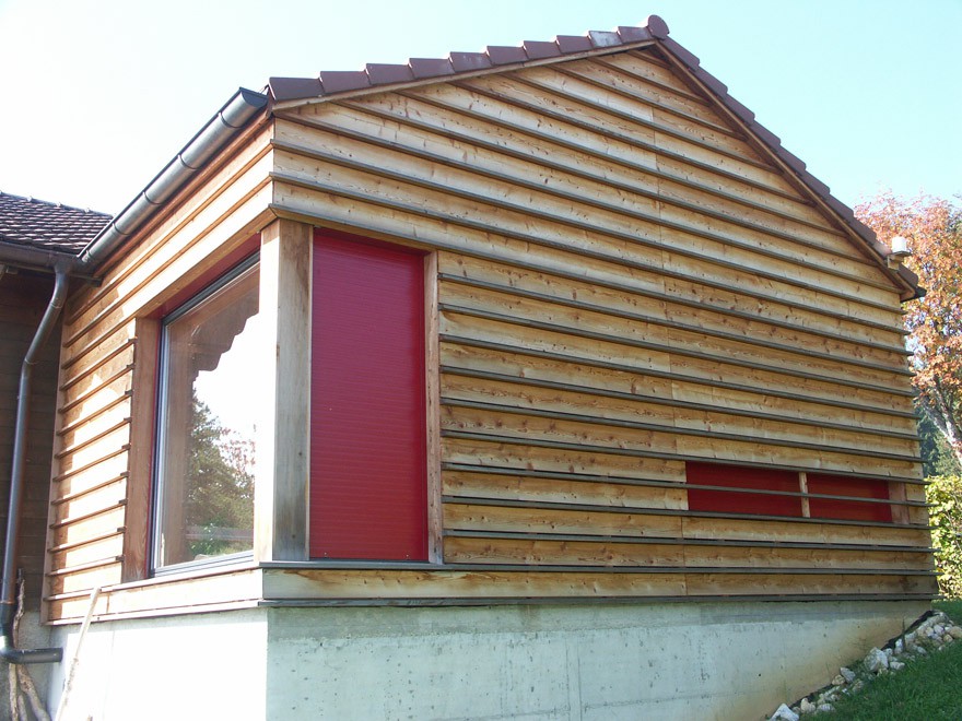 la force des matériaux utilisés, les volumes et le travail de la structure de la façade ont néanmoins conduit à une excellente intégration de cet agrandissement. dans la partie existante, une cheminée recouverte de métal et qui s'imbrique dans le croisement d'un mur en apparaissant dans l'entrée, la salle de bain et le séjour est un clin d'œil au monolithe de jean nouvel réalisé pour expo 02 sur le lac de morat.